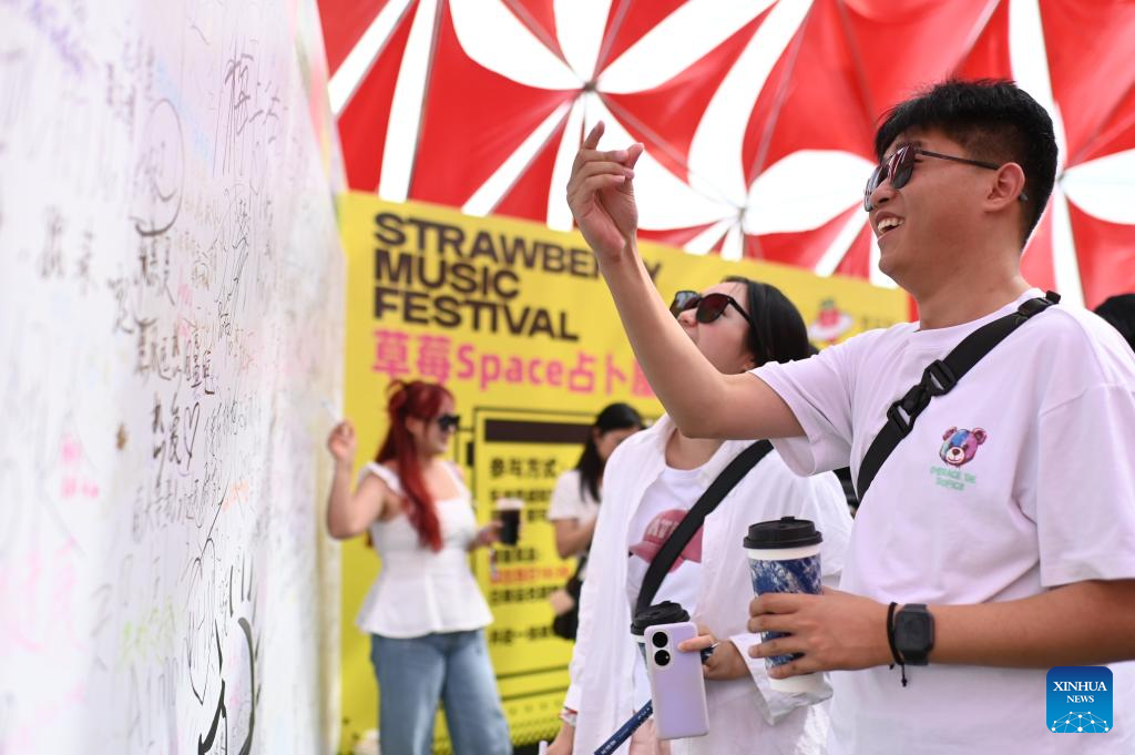 People sign on the signature wall during the Strawberry Music Festival in Urumqi, northwest China's Xinjiang Uygur Autonomous Region, July 12, 2025. The 2025 Strawberry Music Festival kicked off in Urumqi on Saturday. (Photo by Xu Rui/Xinhua)