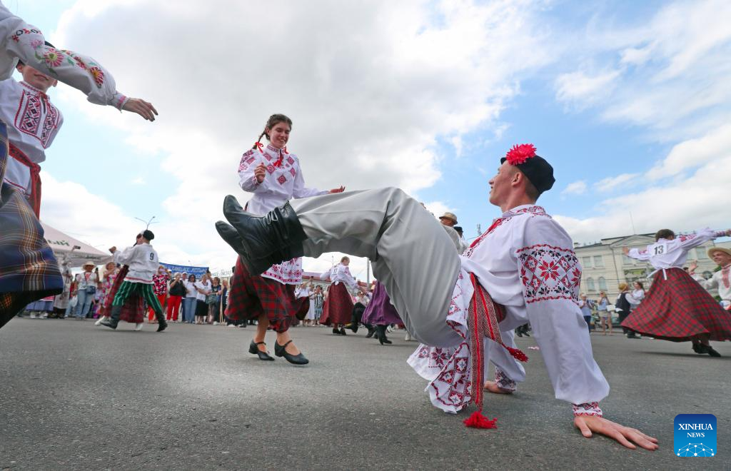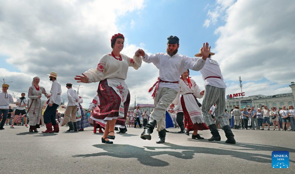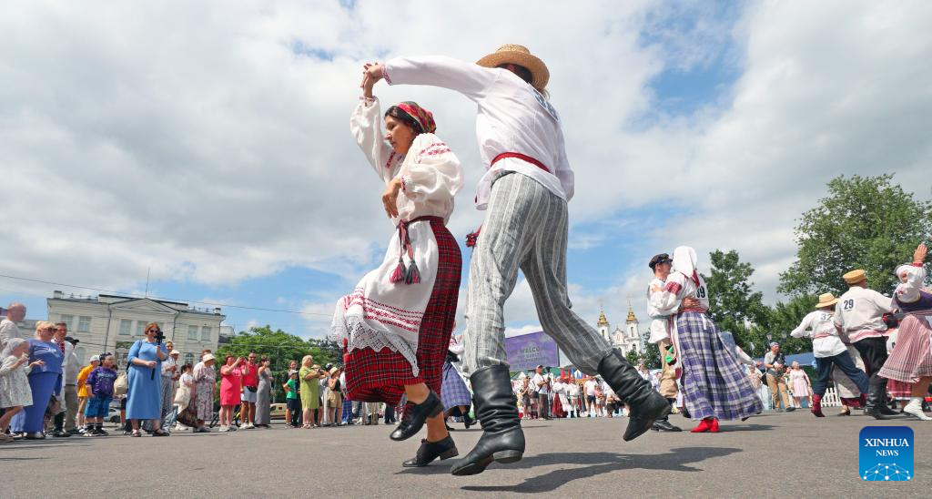 Contestants perform at a dance contest during the 34th International Festival of Arts "Slavianski Bazaar" in Vitebsk, Belarus, July 12, 2025. The 34th International Festival of Arts "Slavianski Bazaar" kicked off in Vitebsk of Belarus on Thursday, bring together prominent performers, artists and creative groups from all over the world. (Photo by Henadz Zhinkov/Xinhua)