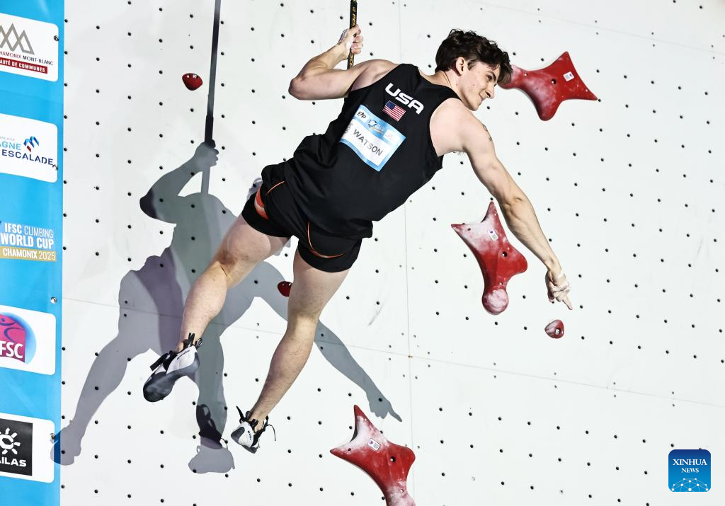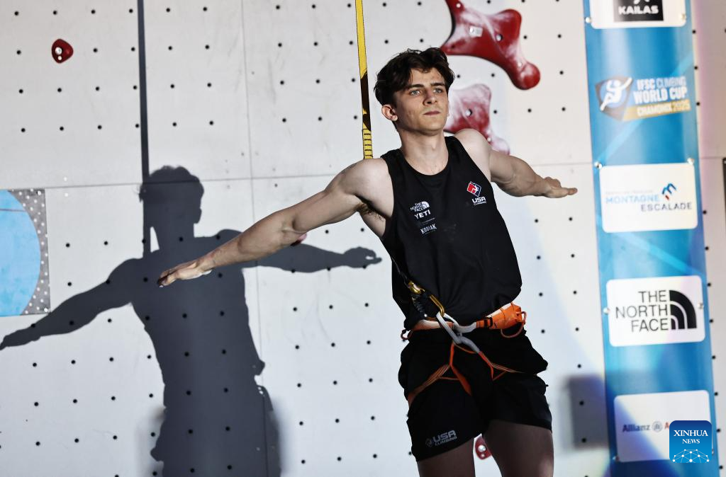 Samuel Watson of the United States reacts after the men's Speed 1/8 final of sport climbing at the 2025 IFSC Climbing World Cup Speed-Lead in Charmonix, France, July 12, 2025. (Xinhua/Gao Jing)