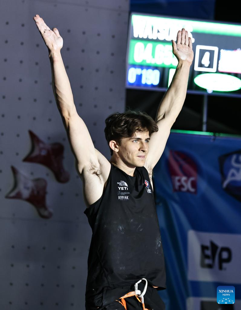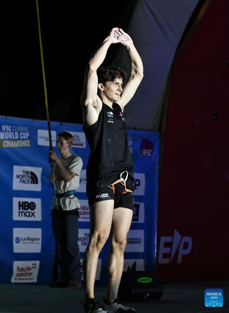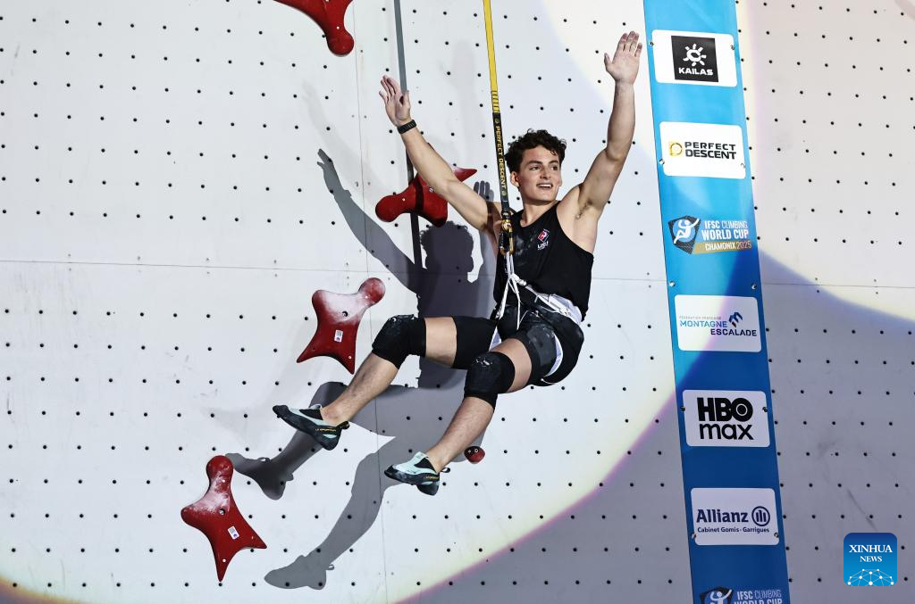Samuel Watson of the United States celebrates after the men's Speed final of sport climbing at the 2025 IFSC Climbing World Cup Speed-Lead in Charmonix, France, July 12, 2025. (Xinhua/Gao Jing)