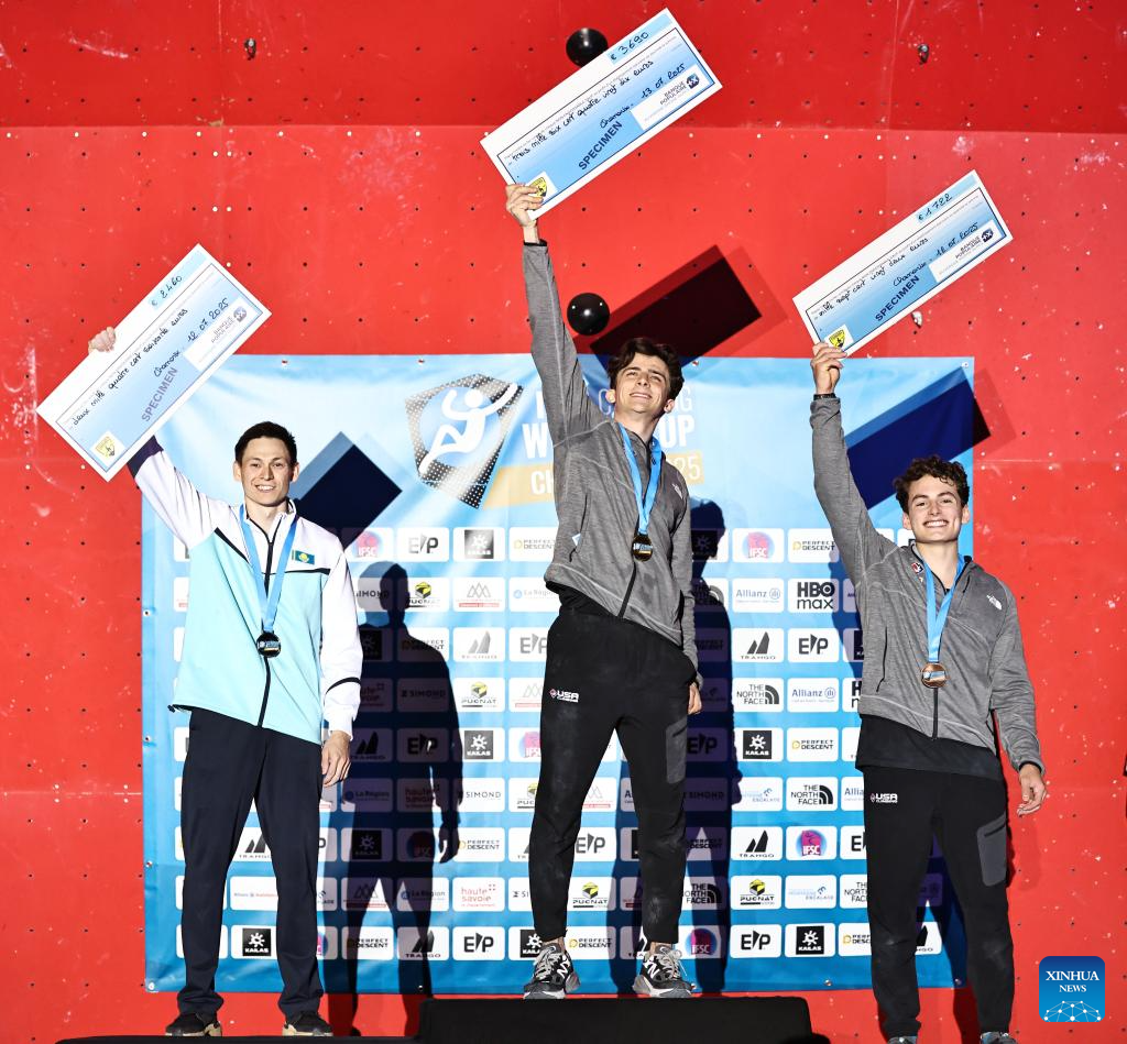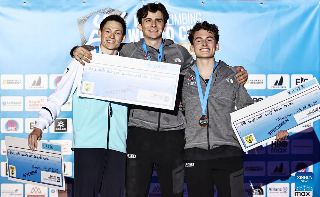 First-placed Samuel Watson (C) of the United States, second-placed Rishat Khaibullin (L) of Kazakstan and third-placed Zach Hammer of the United States pose during the awarding ceremony for the men's Speed final of sport climbing at the 2025 IFSC Climbing World Cup Speed-Lead in Charmonix, France, July 12, 2025. (Xinhua/Gao Jing)