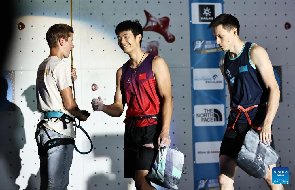Long Jianguo (C) of China reacts after the men's Speed quarterfinal of sport climbing at the 2025 IFSC Climbing World Cup Speed-Lead in Charmonix, France, July 12, 2025. (Xinhua/Gao Jing)