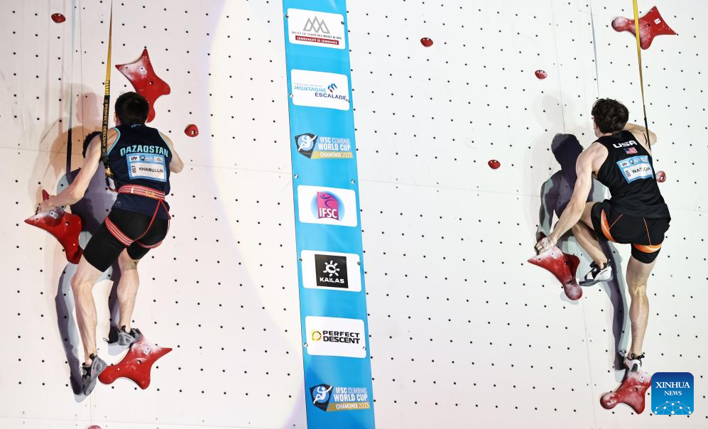 Samuel Watson (R) of the United States and Rishat Khaibullin of Kazakstan compete during the men's Speed final of sport climbing at the 2025 IFSC Climbing World Cup Speed-Lead in Charmonix, France, July 12, 2025. (Xinhua/Gao Jing)