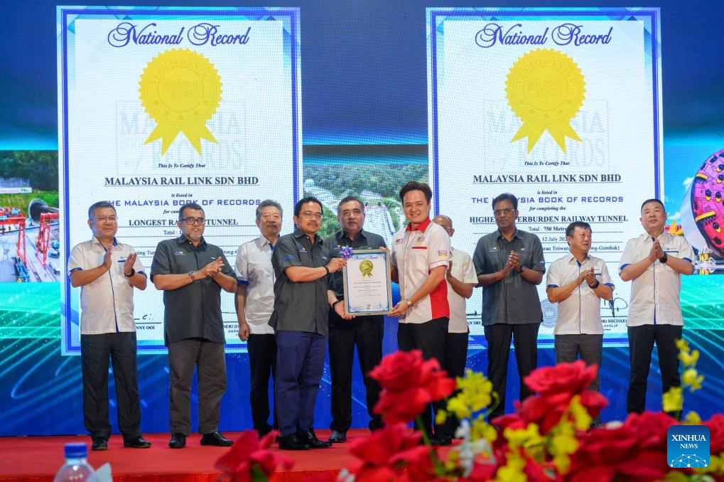 This photo taken on July 12, 2025 shows a ceremony marking the breakthrough of the 16.39-kilometer Genting Tunnel of the East Coast Rail Link (ECRL) in Pahang state, Malaysia. The East Coast Rail Link (ECRL), a mega rail project in Malaysia being built by the China Communications Construction Company (CCCC), marked another key milestone on Saturday with the breakthrough of the 16.39-kilometer Genting Tunnel.