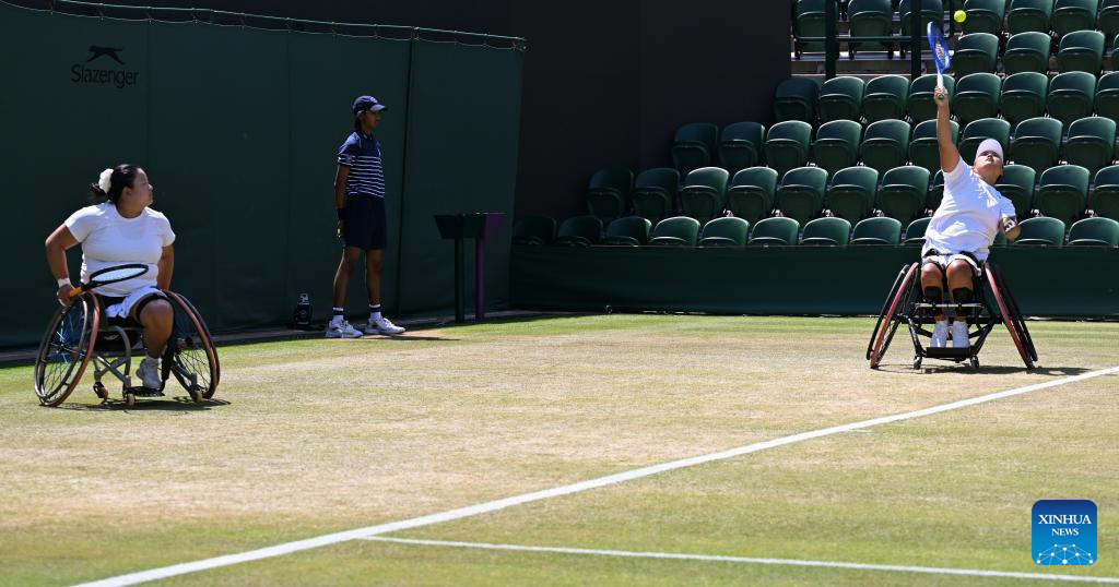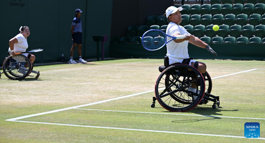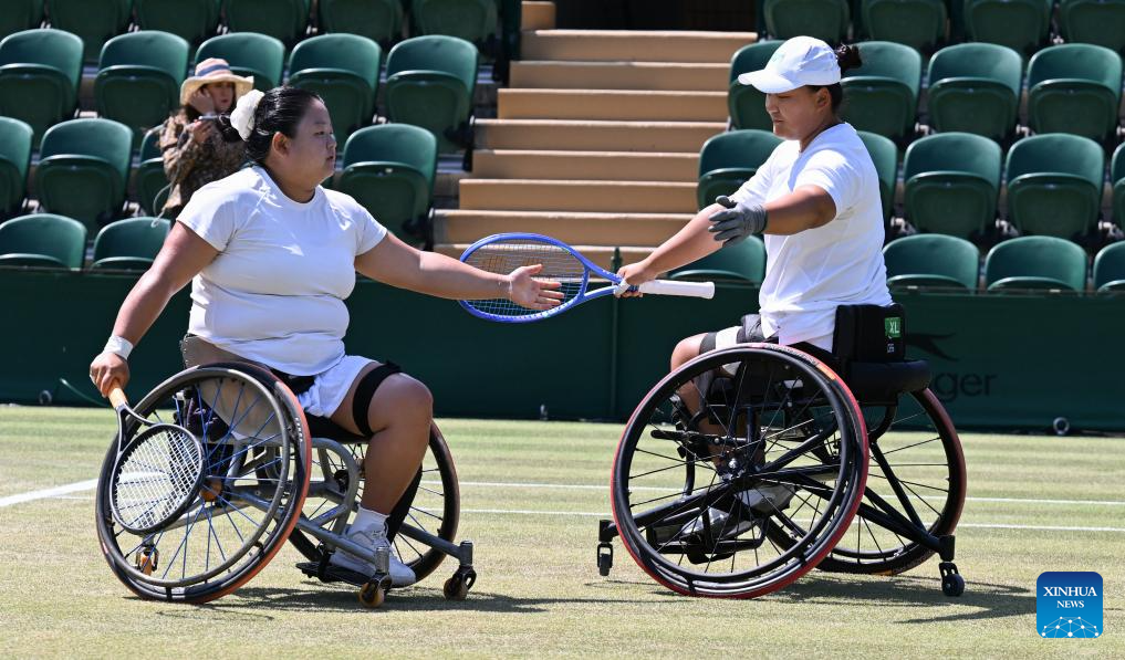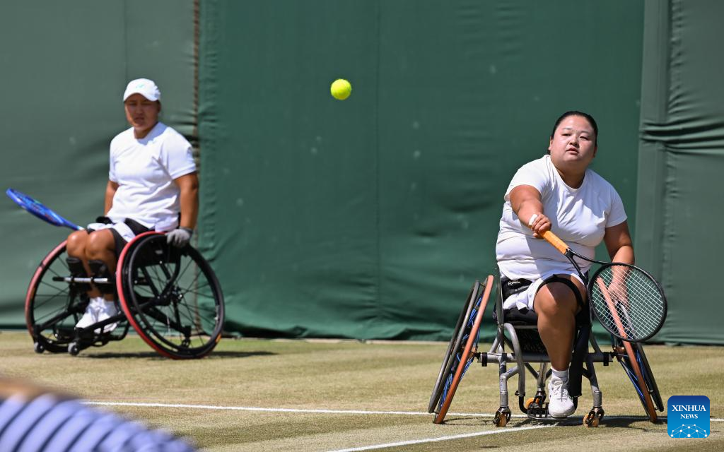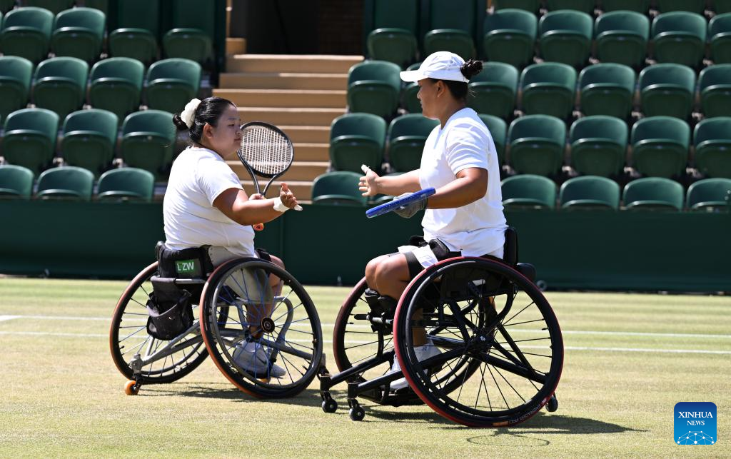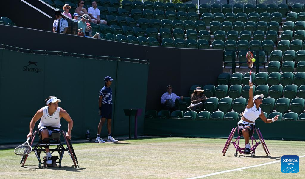 Li Xiaohui/Wang Ziying (R) compete during the women's wheelchair doubles final between Li Xiaohui/Wang Ziying of China and Angelica Bernal (Colombia)/Ksenia Chasteau (France) at the Wimbledon Tennis Championships in London, Britain, July 13, 2025. (Xinhua/Zhao Dingzhe)