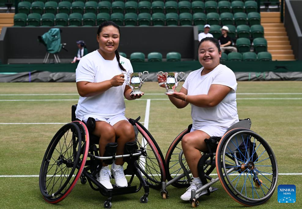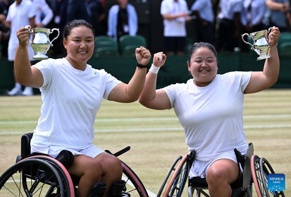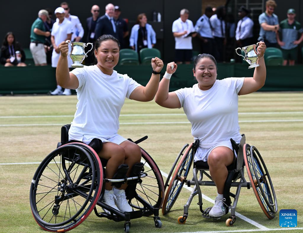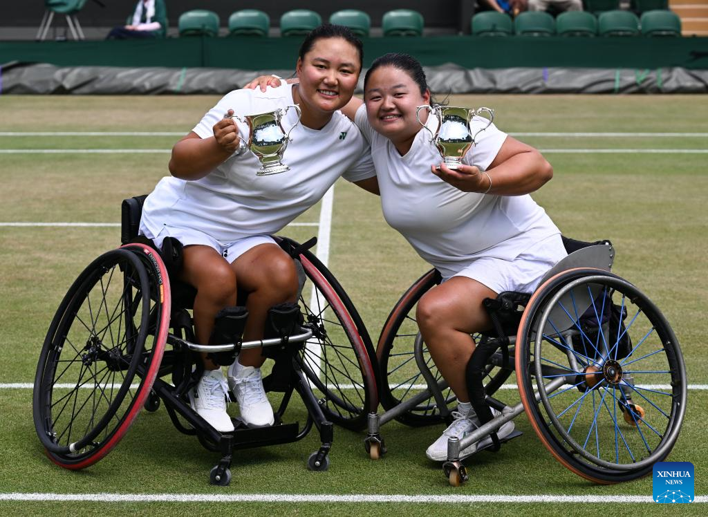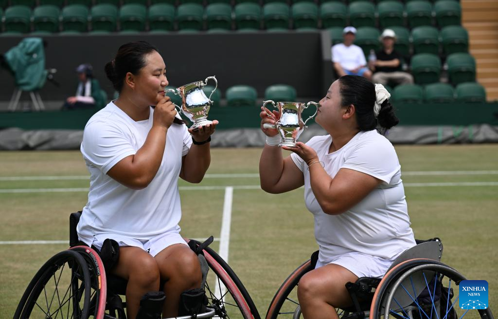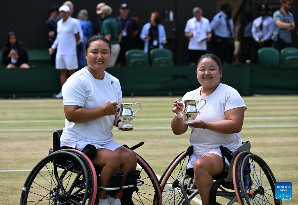 Li Xiaohui/Wang Ziying (R) pose during the awarding ceremony after the women's wheelchair doubles final between Li Xiaohui/Wang Ziying of China and Angelica Bernal (Colombia)/ Ksenia Chasteau (France) at the Wimbledon Tennis Championships in London, Britain, July 13, 2025. (Xinhua/Zhao Dingzhe)