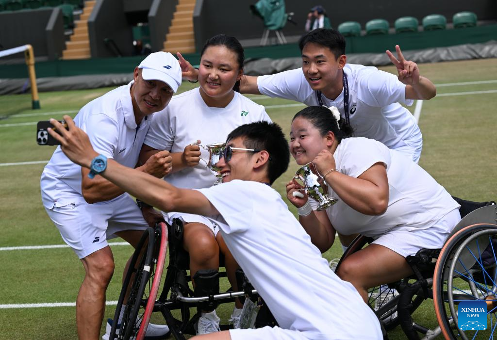 Li Xiaohui (2nd L)/Wang Ziying (2nd R) of China pose with their team after the awarding ceremony for women's wheelchair doubles at the Wimbledon Tennis Championships in London, Britain, July 13, 2025. (Xinhua/Zhao Dingzhe)