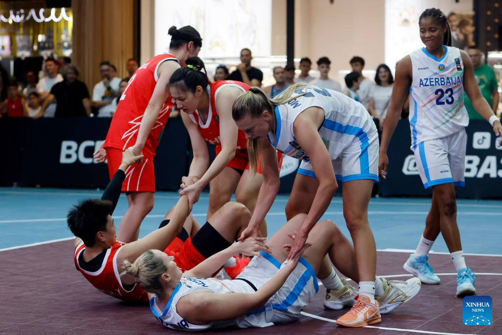 China's Yang Hengyu (down, L) and Azerbaijan's Dina Ulyanova (down, R) are helped by their teammates during the FIBA 3X3 Women's Series basketball match between China and Azerbaijan at Parklake mall in Bucharest, Romania, July 13, 2025. (Photo by Cristian Cristel/Xinhua)