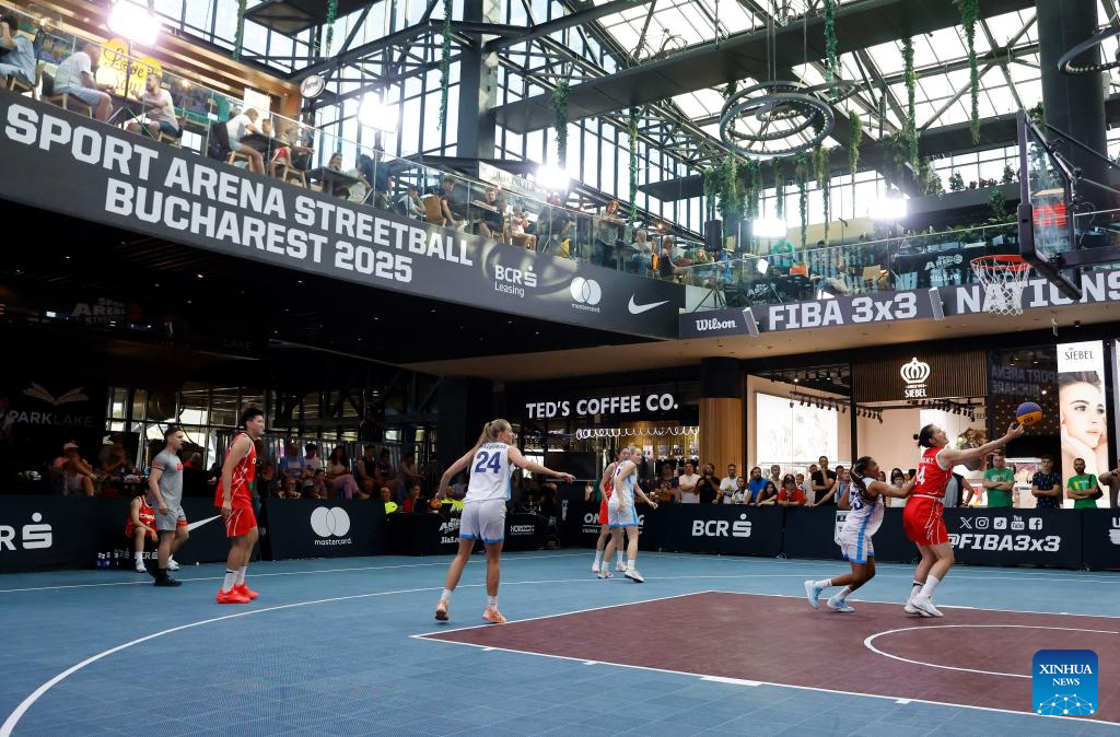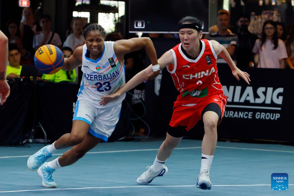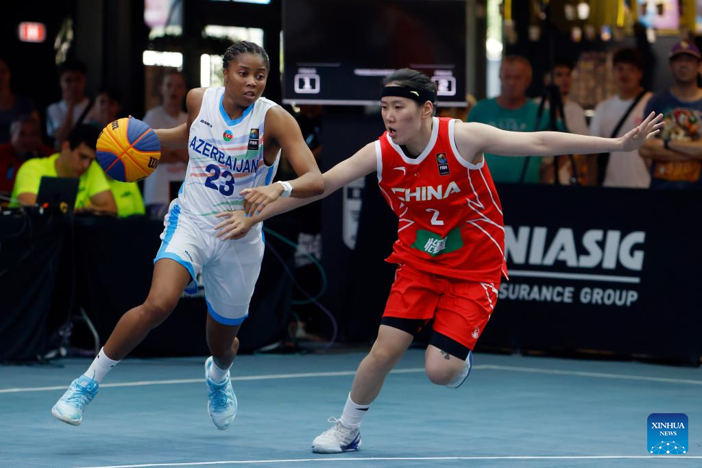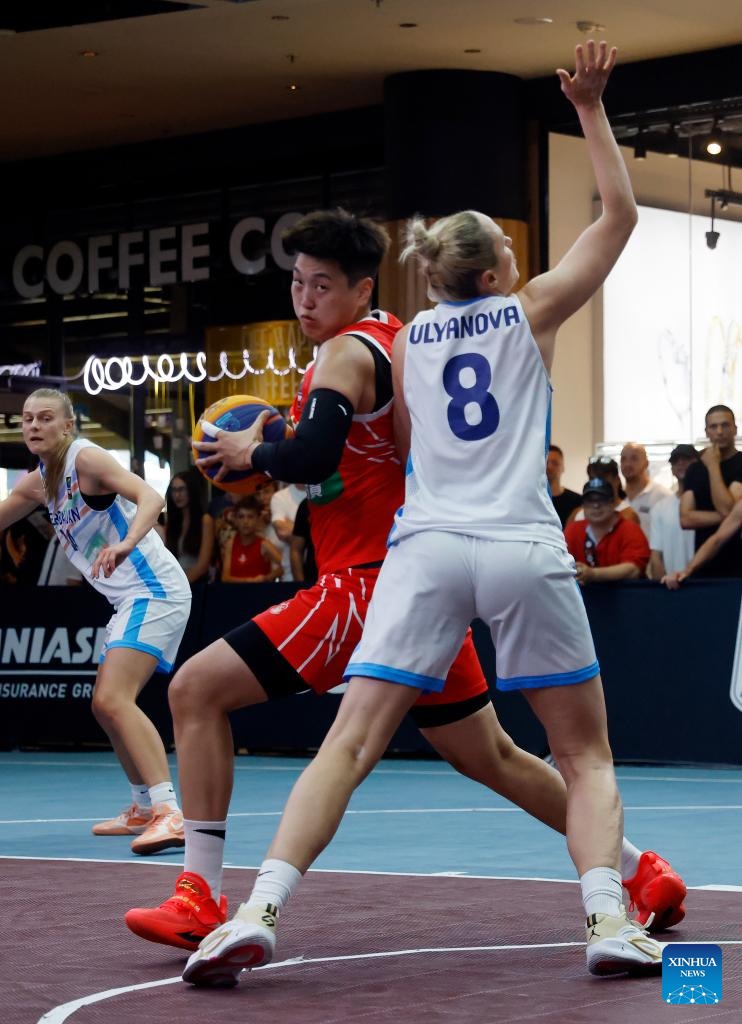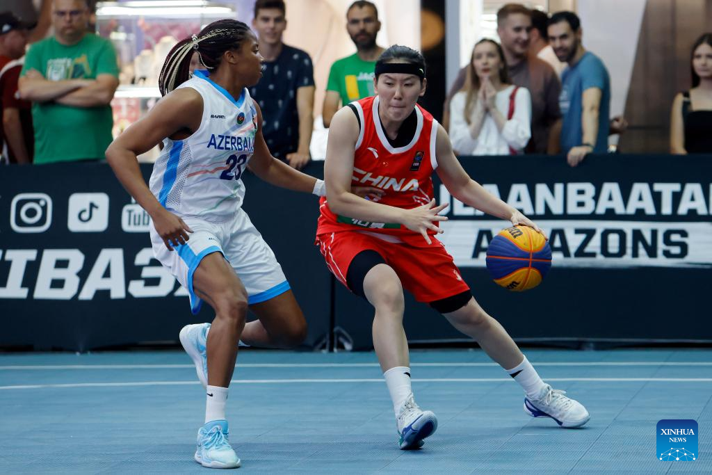 China's Zhou Mengyun (1st R) competes during the FIBA 3X3 Women's Series basketball match between China and Azerbaijan at Parklake mall in Bucharest, Romania, July 13, 2025. (Photo by Cristian Cristel/Xinhua)