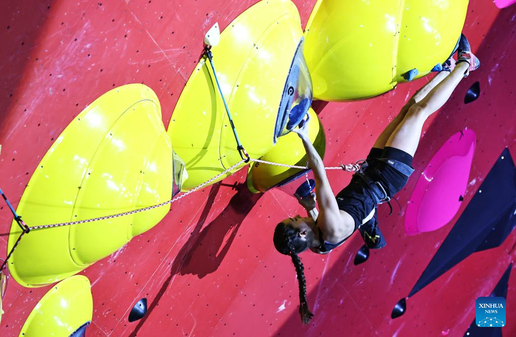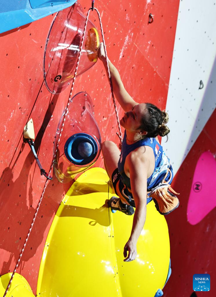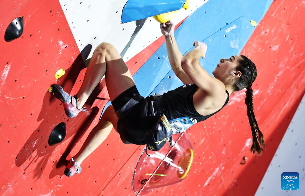 Geila Macia Martin of Spain competes during the women's lead final of sport climbing at the 2025 IFSC Climbing World Cup Speed-Lead in Chamonix, France, July 13, 2025. (Xinhua/Gao Jing)