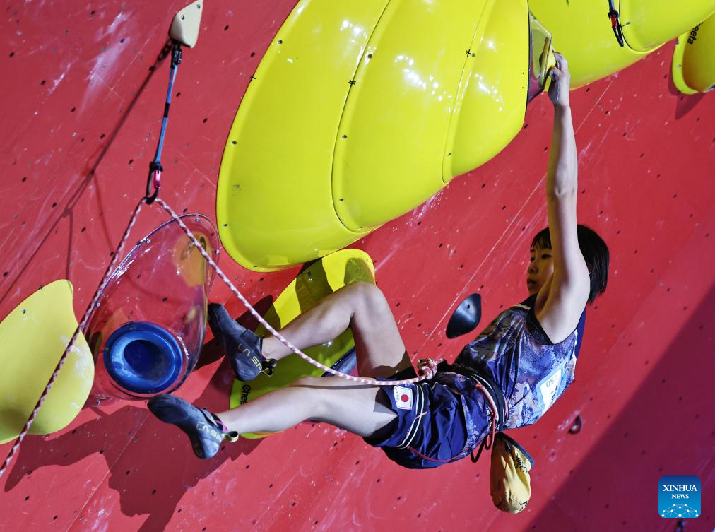Tanii Natsuki of Japan competes during the women's lead final of sport climbing at the 2025 IFSC Climbing World Cup Speed-Lead in Chamonix, France, July 13, 2025. (Xinhua/Gao Jing)