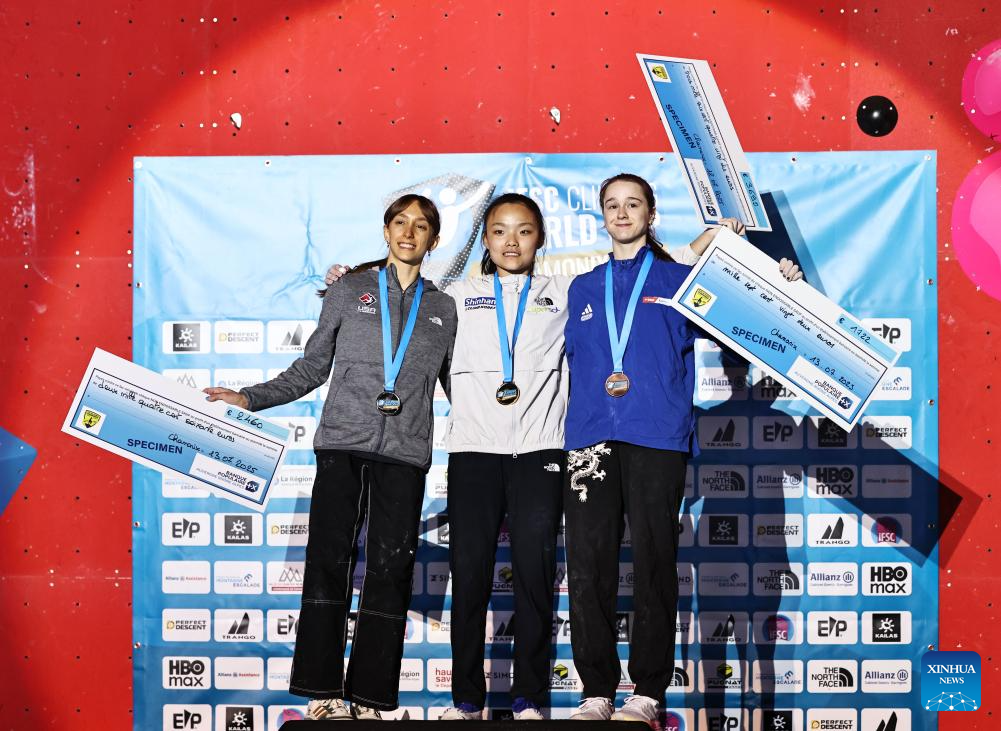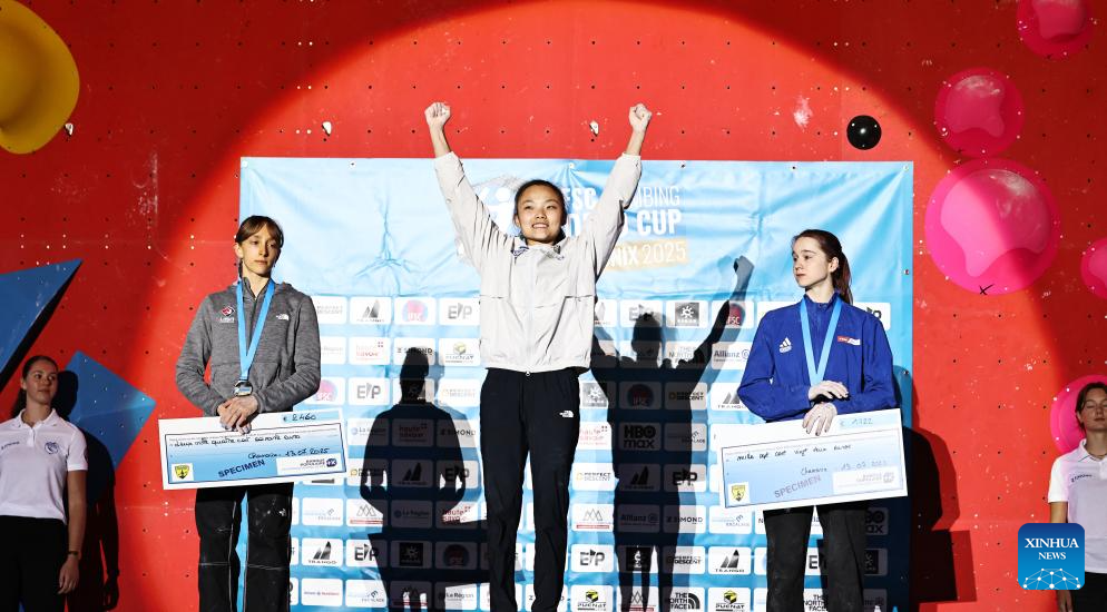 (L to R) Second-placed Annie Sanders of the United States, first-placed Seo Chaehyun of South Korea and third-placed Erin McNeice of Great Britain pose during the awarding ceremony for the women's lead final of sport climbing at the 2025 IFSC Climbing World Cup Speed-Lead in Chamonix, France, July 13, 2025. (Xinhua/Gao Jing)