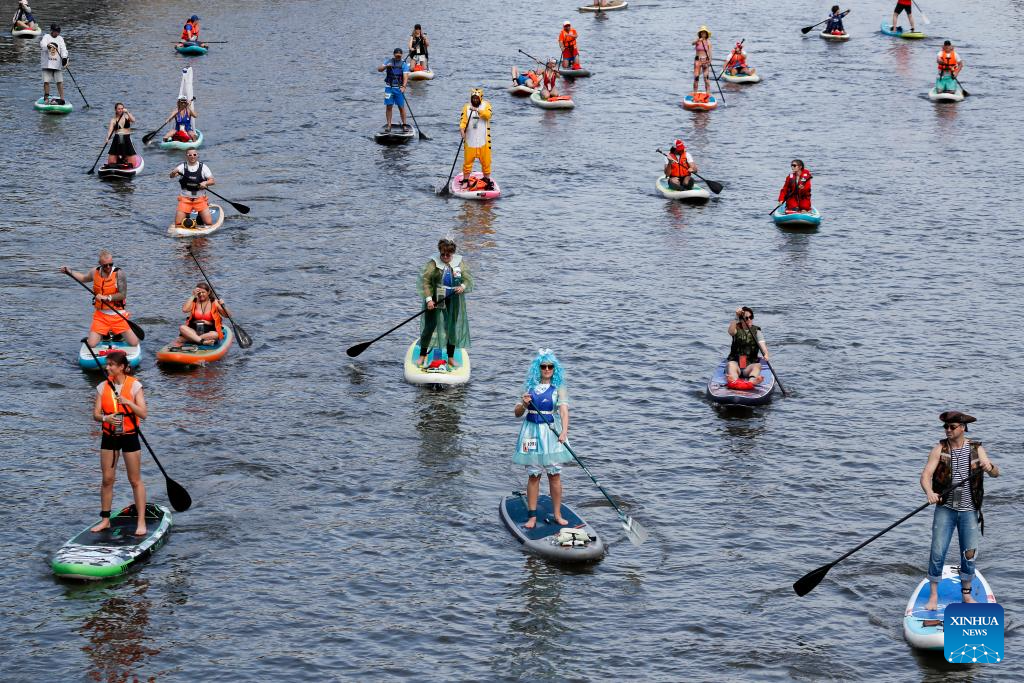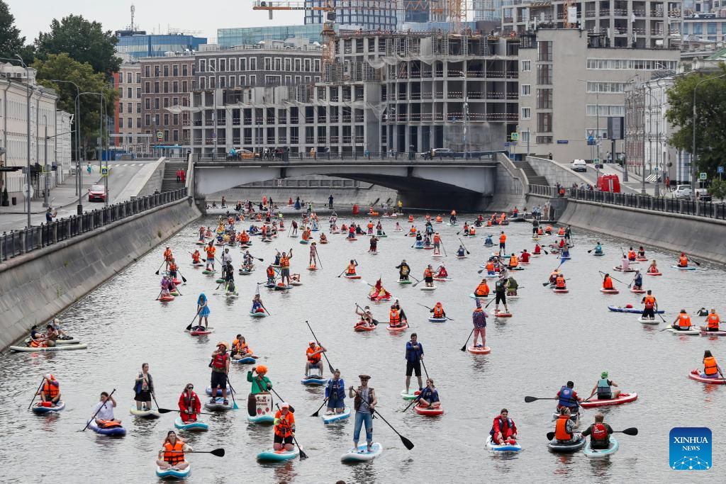 Participants take part in the SUP (Stand Up Paddling) parade in Moscow, Russia, July 13, 2025. (Photo by Alexander Zemlianichenko Jr/Xinhua)