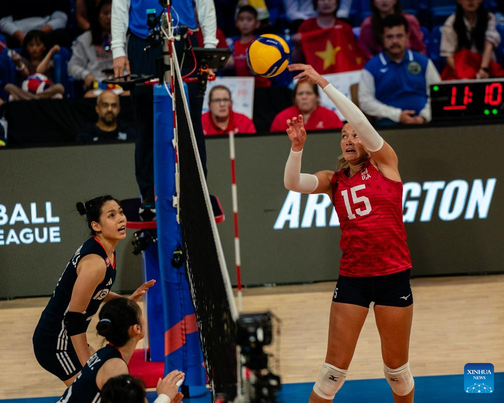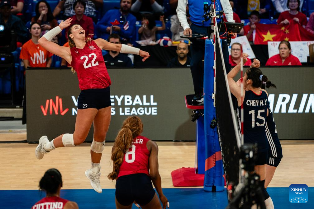 Fairbanks (R) of the United States tips the ball during the match between China and the United States at the Women's Volleyball Nations League (VNL) 2025 in Arlington, the United States, July 13, 2025. (Photo by Chen Chen/Xinhua)