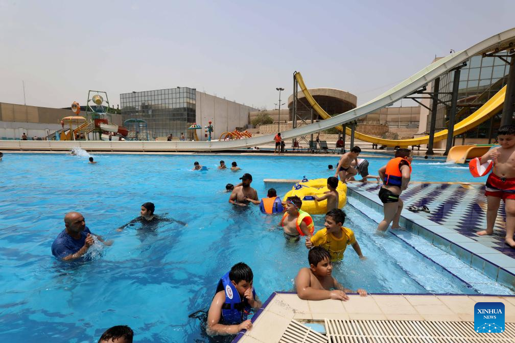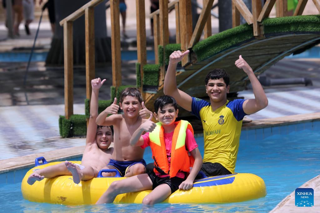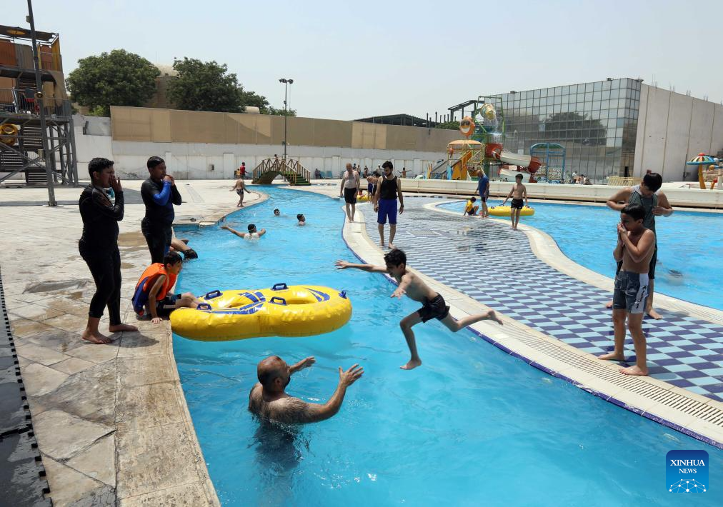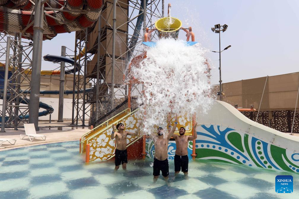 People cool off at a water park amid a heatwave in Baghdad, Iraq, on July 13, 2025. (Xinhua/Khalil Dawood)