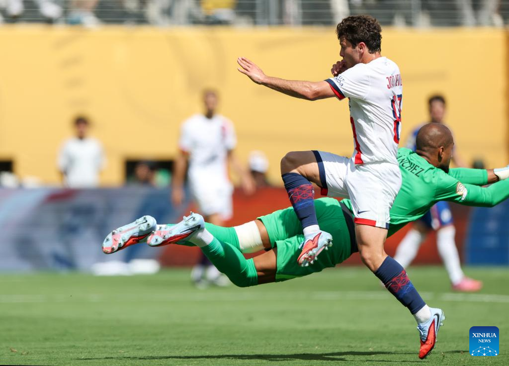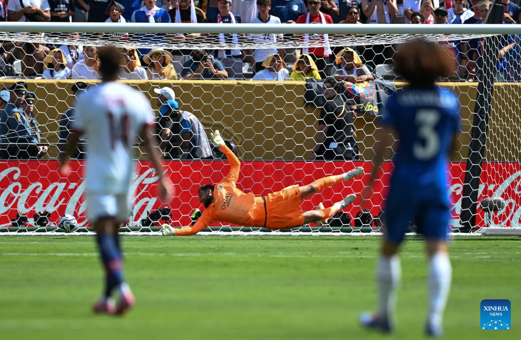 Goalkeeper Gianluigi Donnarumma (back) of Paris Saint-Germain fails to save the ball during the final match between Chelsea FC (England) and Paris Saint-Germain (France) at the FIFA Club World Cup 2025 at the MetLife Stadium, New Jersey, the United States, July 13, 2025. (Xinhua/Li Rui)