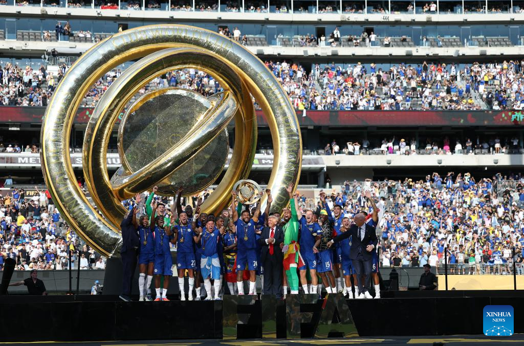 U.S. President Donald Trump (C) and FIFA president Gianni Infantino (R) celebrate with team members of Chelsea FC during the awarding ceremony for the final match between Chelsea FC (England) and Paris Saint-Germain (France) at the FIFA Club World Cup 2025 at the MetLife Stadium, New Jersey, the United States, July 13, 2025. (Xinhua/Li Ming)