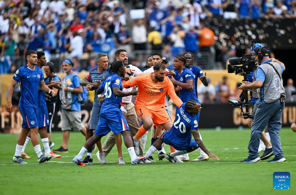 Goalkeeper Gianluigi Donnarumma (C) of Paris Saint-Germain argues with Joao Pedro (bottom) of Chelsea FC after the final match between Chelsea FC (England) and Paris Saint-Germain (France) at the FIFA Club World Cup 2025 at the MetLife Stadium, New Jersey, the United States, July 13, 2025. (Xinhua/Li Rui)