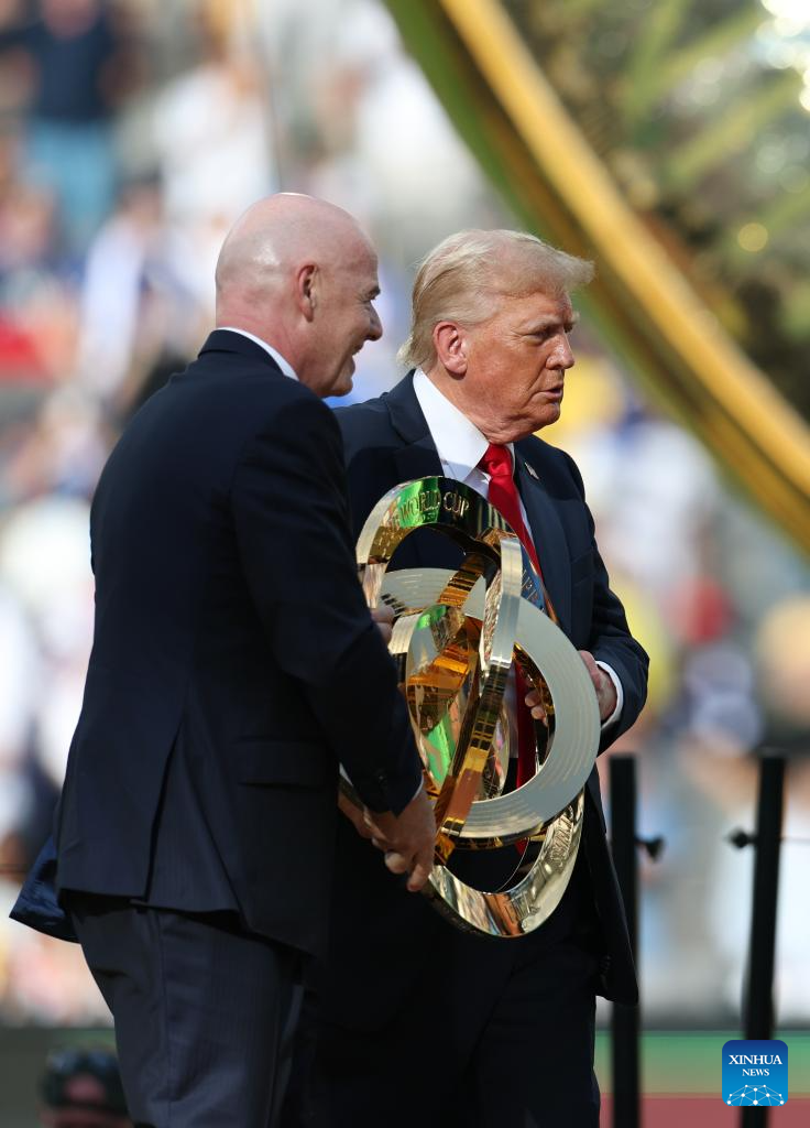 U.S. President Donald Trump (R) and FIFA president Gianni Infantino hold the trophy during the awarding ceremony for the final match between Chelsea FC (England) and Paris Saint-Germain (France) at the FIFA Club World Cup 2025 at the MetLife Stadium, New Jersey, the United States, July 13, 2025. (Xinhua/Li Ming)