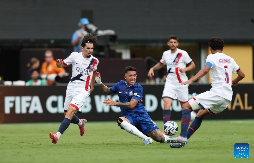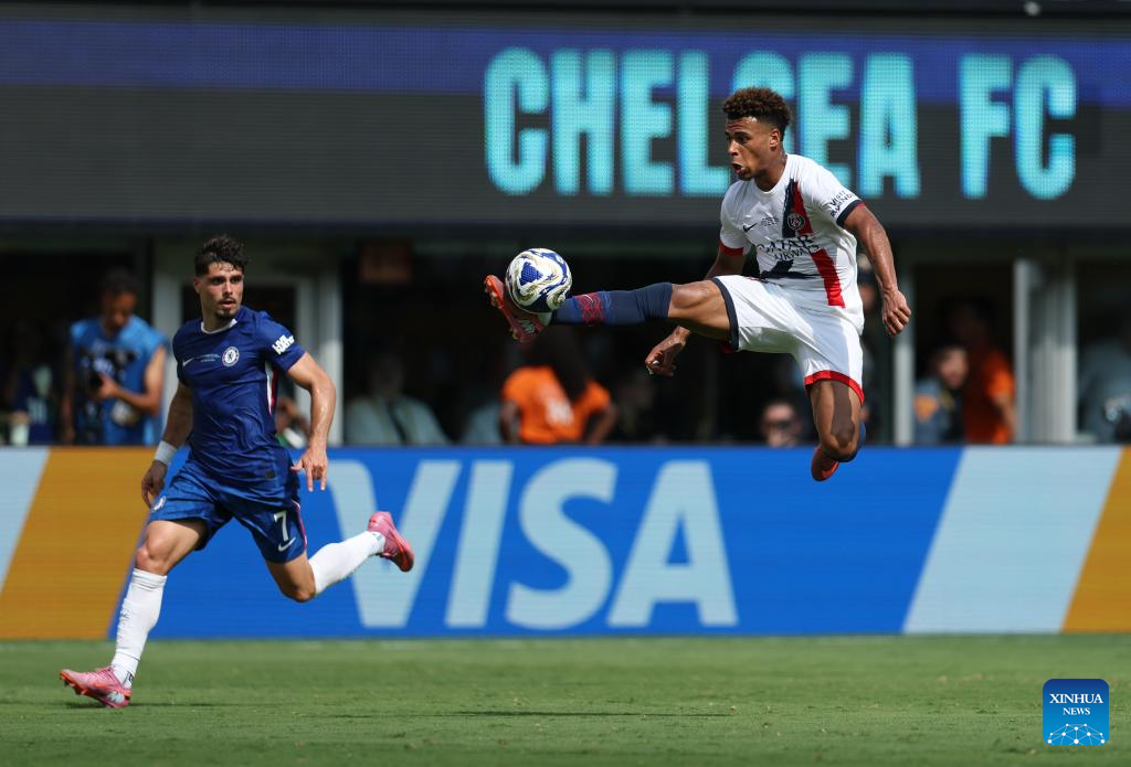 Joao Neves (front) of Paris Saint-Germain competes during the final match between Chelsea FC (England) and Paris Saint-Germain (France) at the FIFA Club World Cup 2025 at the MetLife Stadium, New Jersey, the United States, July 13, 2025. (Xinhua/Li Ming)