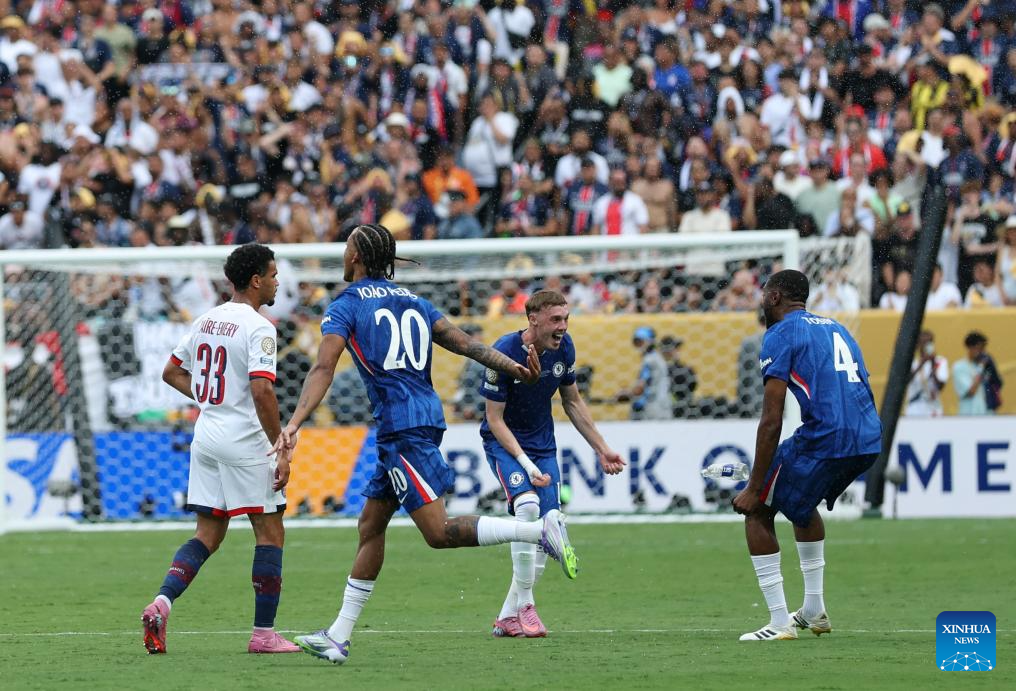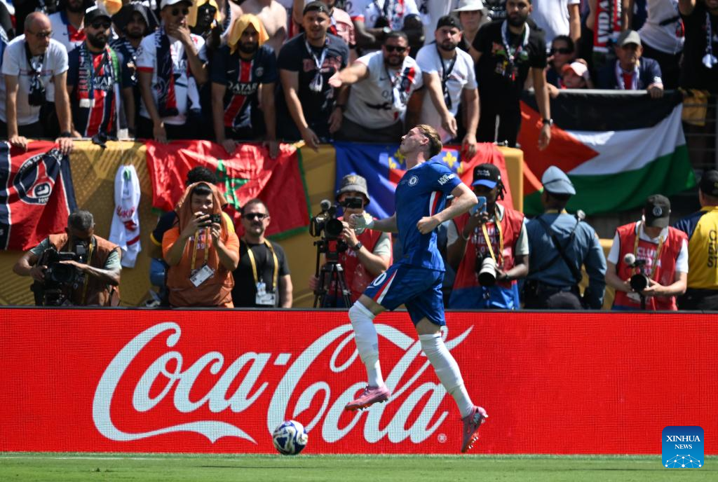 Cole Palmer of Chelsea FC celebrates scoring during the final match between Chelsea FC (England) and Paris Saint-Germain (France) at the FIFA Club World Cup 2025 at the MetLife Stadium, New Jersey, the United States, July 13, 2025. (Xinhua/Li Rui)