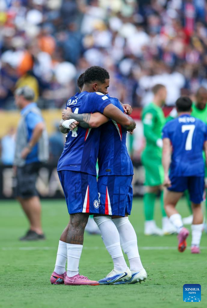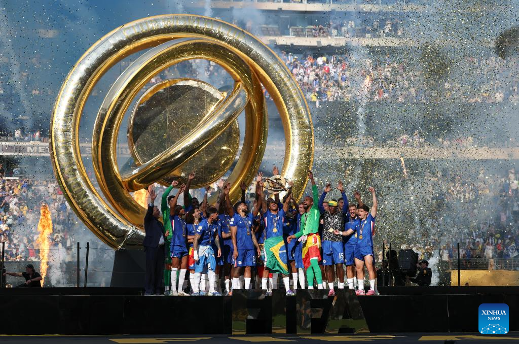 Players of Chelsea FC celebrate winning the final match between Chelsea FC (England) and Paris Saint-Germain (France) at the FIFA Club World Cup 2025 at the MetLife Stadium, New Jersey, the United States, July 13, 2025. (Xinhua/Li Ming)