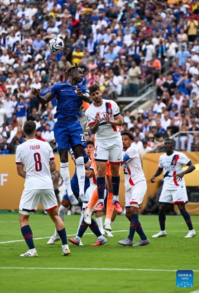 Lucas Beraldo (top R) of Paris Saint-Germain and Trevoh Chalobah (top L) of Chelsea FC vie for the head ball during the final match between Chelsea FC (England) and Paris Saint-Germain (France) at the FIFA Club World Cup 2025 at the MetLife Stadium, New Jersey, the United States, July 13, 2025. (Xinhua/Li Rui)