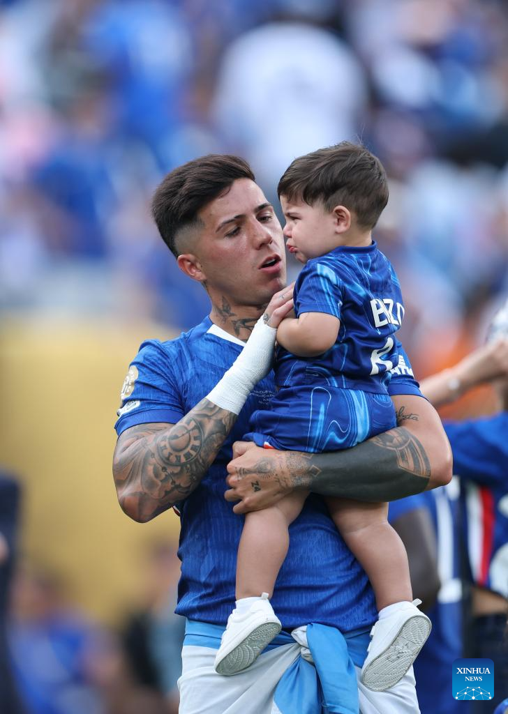 Enzo Fernandez (L) of Chelsea FC with his son after the final match between Chelsea FC (England) and Paris Saint-Germain (France) at the FIFA Club World Cup 2025 at the MetLife Stadium, New Jersey, the United States, July 13, 2025. (Xinhua/Li Ming)