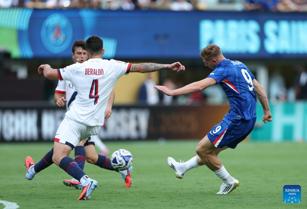 Liam Delap (R) of Chelsea FC shoots during the final match between Chelsea FC (England) and Paris Saint-Germain (France) at the FIFA Club World Cup 2025 at the MetLife Stadium, New Jersey, the United States, July 13, 2025. (Xinhua/Li Ming)