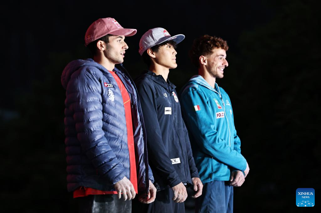 (L to R) Second-placed Alberto Gines Lopez of Spain, first-placed Anraku Sorato of Japan and third-placed Filip Schenk of Italy pose during the awarding ceremony for the men's lead final of sport climbing at the 2025 IFSC Climbing World Cup Speed-Lead in Charmonix, France, July 13, 2025. (Xinhua/Gao Jing)