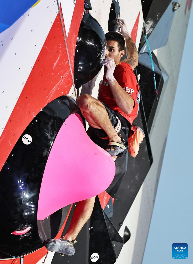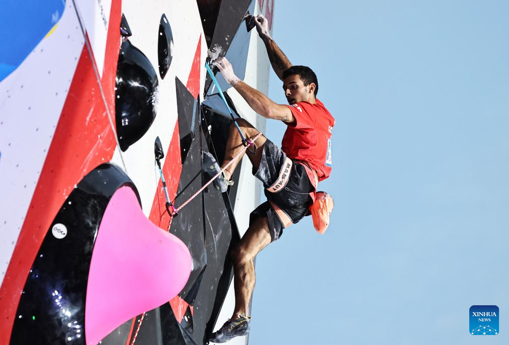 Alberto Gines Lopez of Spain competes during the men's lead final of sport climbing at the 2025 IFSC Climbing World Cup Speed-Lead in Charmonix, France, July 13, 2025. (Xinhua/Gao Jing)