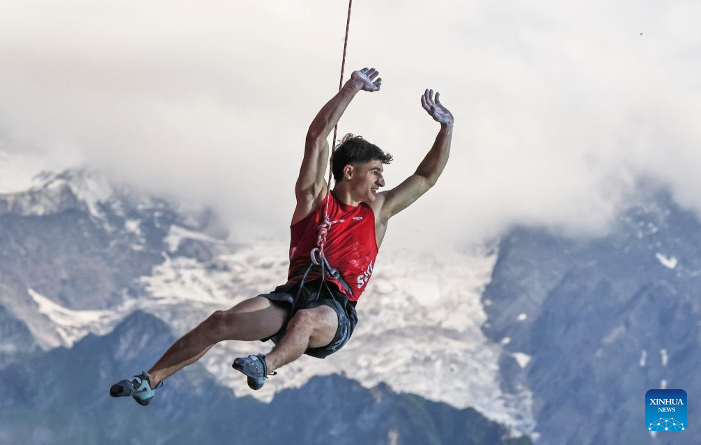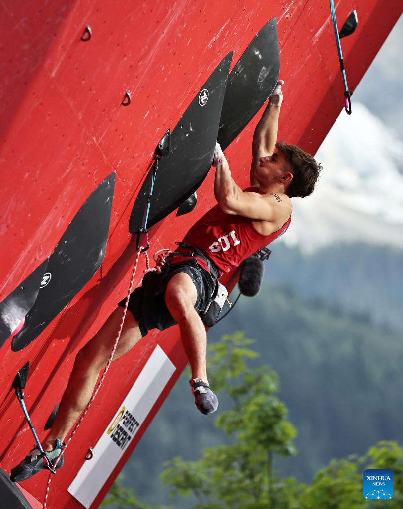 Jonas Utelli of Switzerland competes during the men's lead final of sport climbing at the 2025 IFSC Climbing World Cup Speed-Lead in Charmonix, France, July 13, 2025. (Xinhua/Gao Jing)