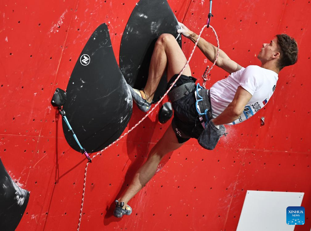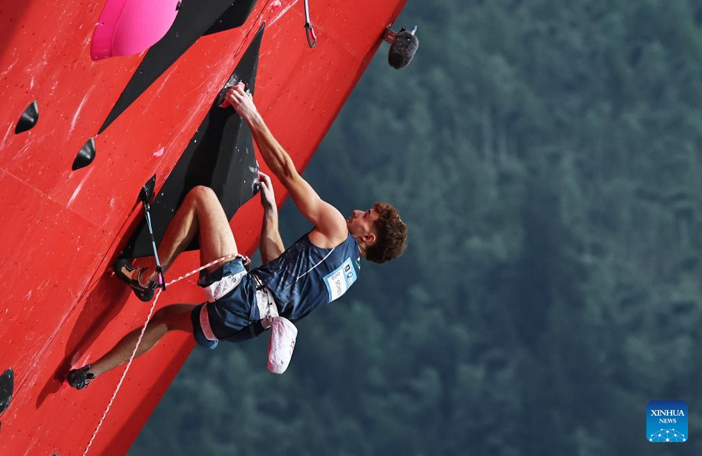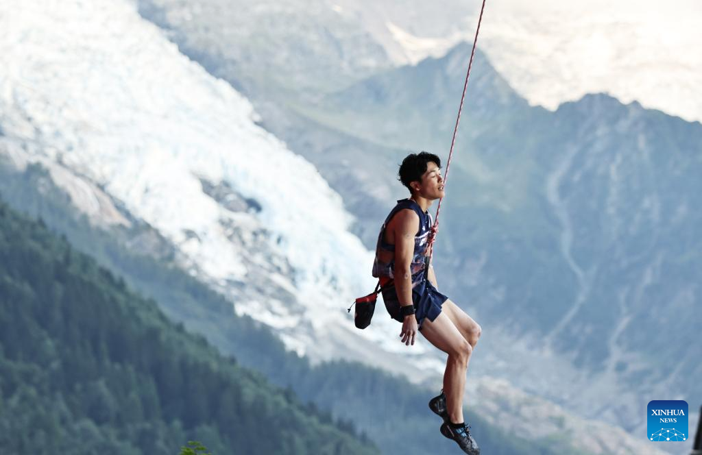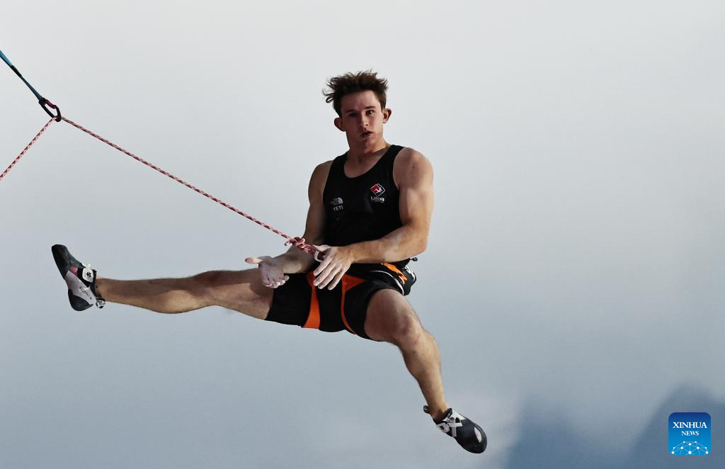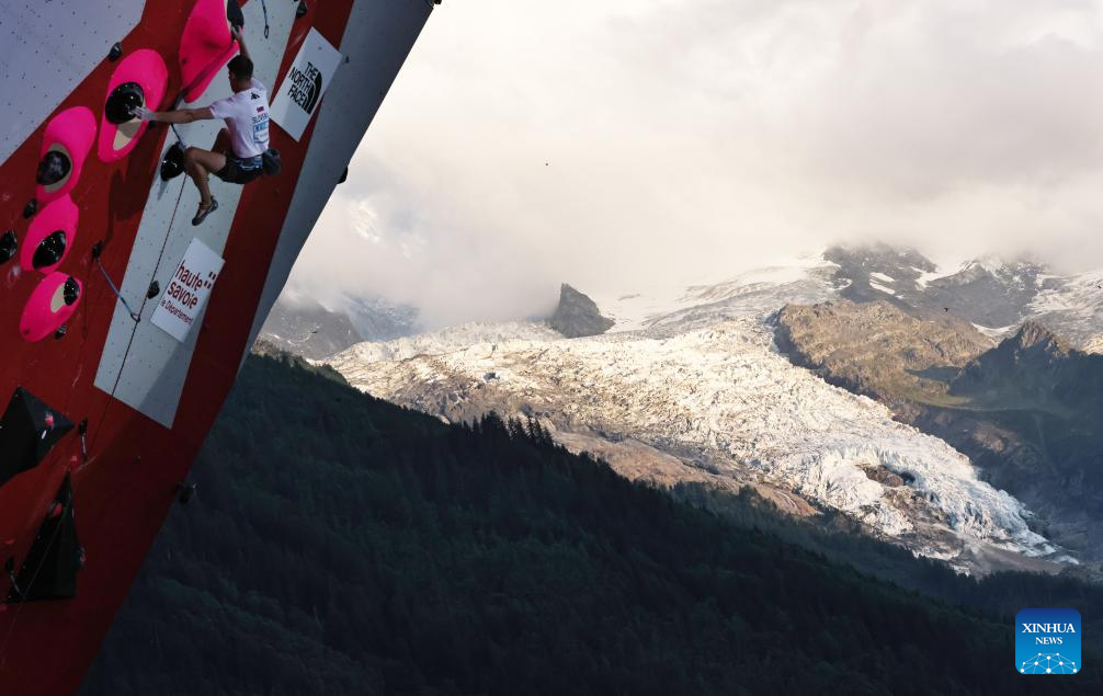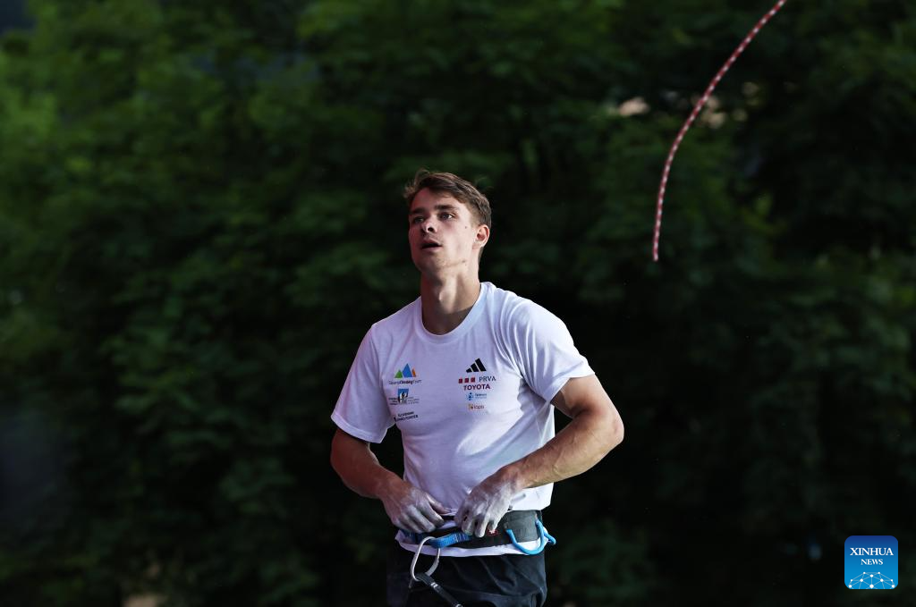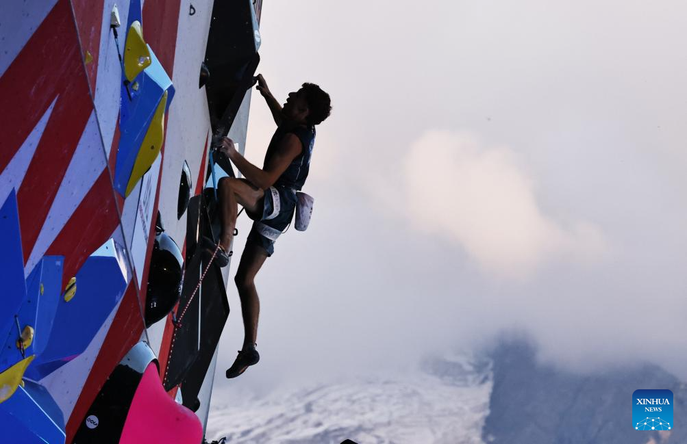 Luka Potocar of Slovenia competes during the men's lead final of sport climbing at the 2025 IFSC Climbing World Cup Speed-Lead in Charmonix, France, July 13, 2025. (Xinhua/Gao Jing)
