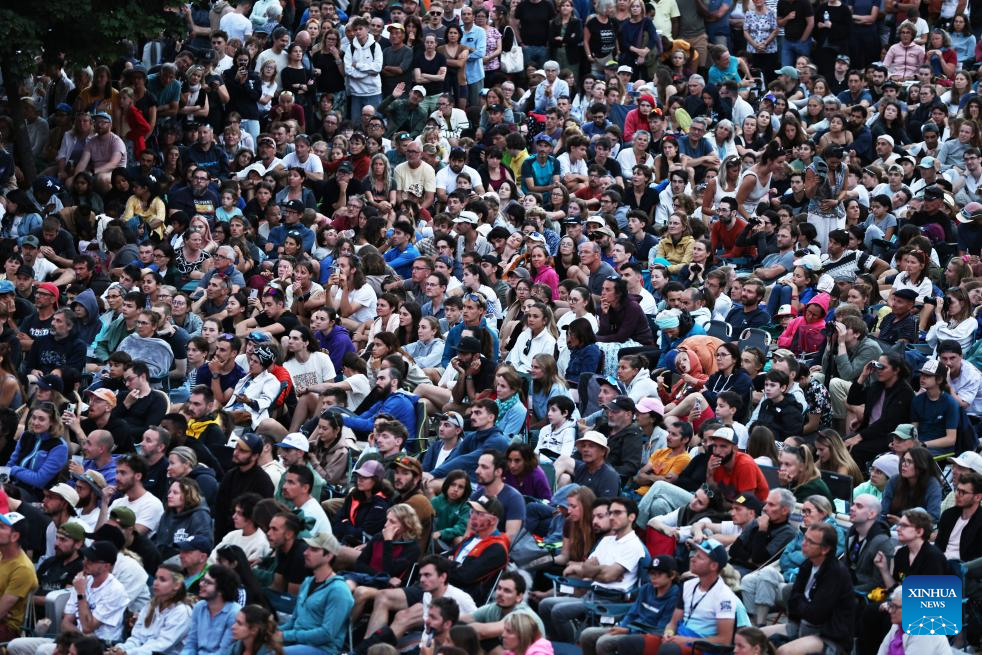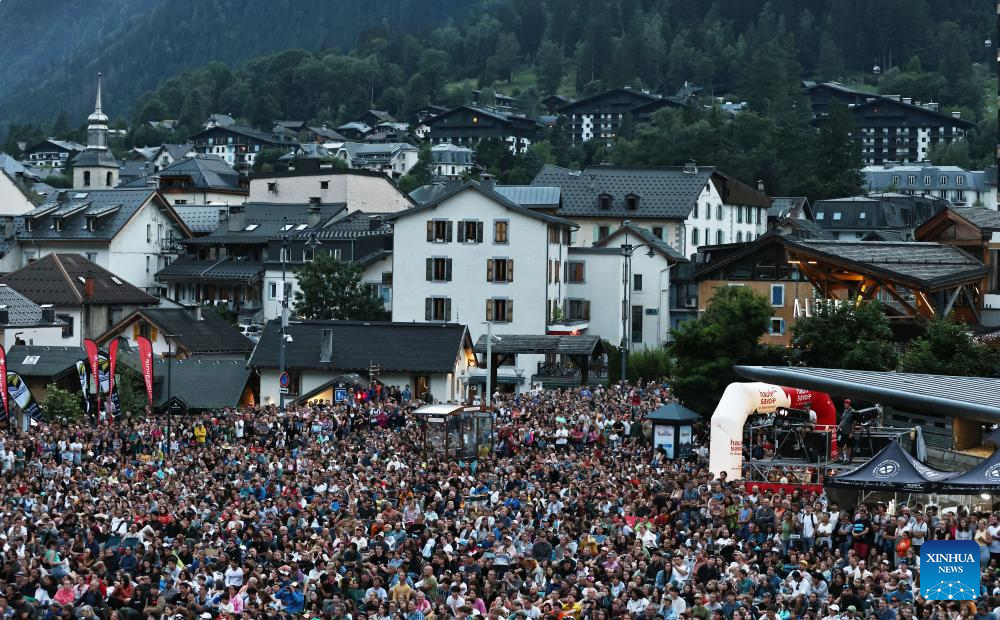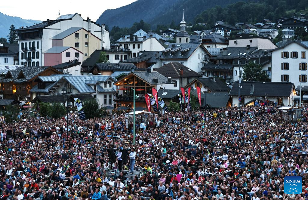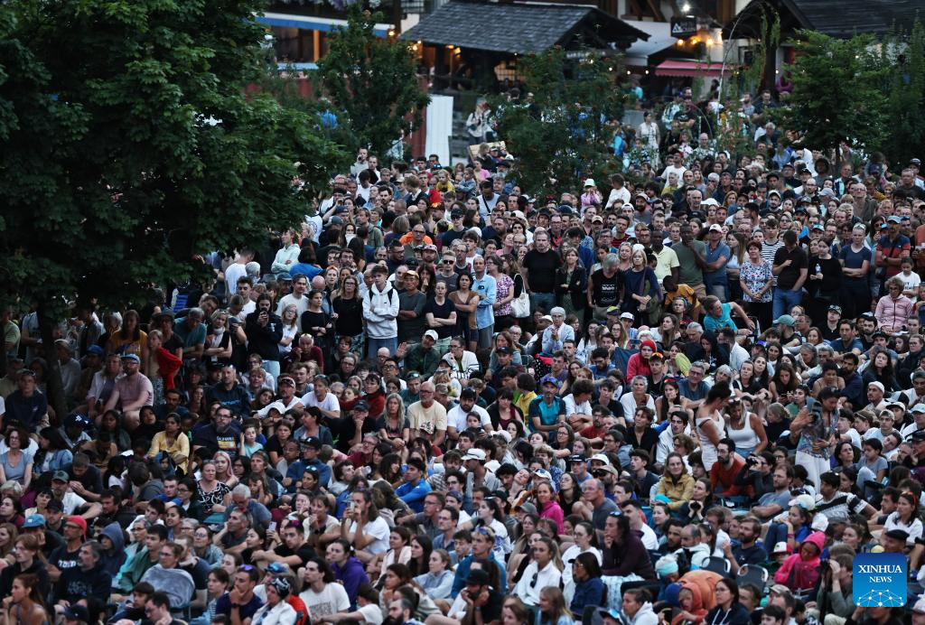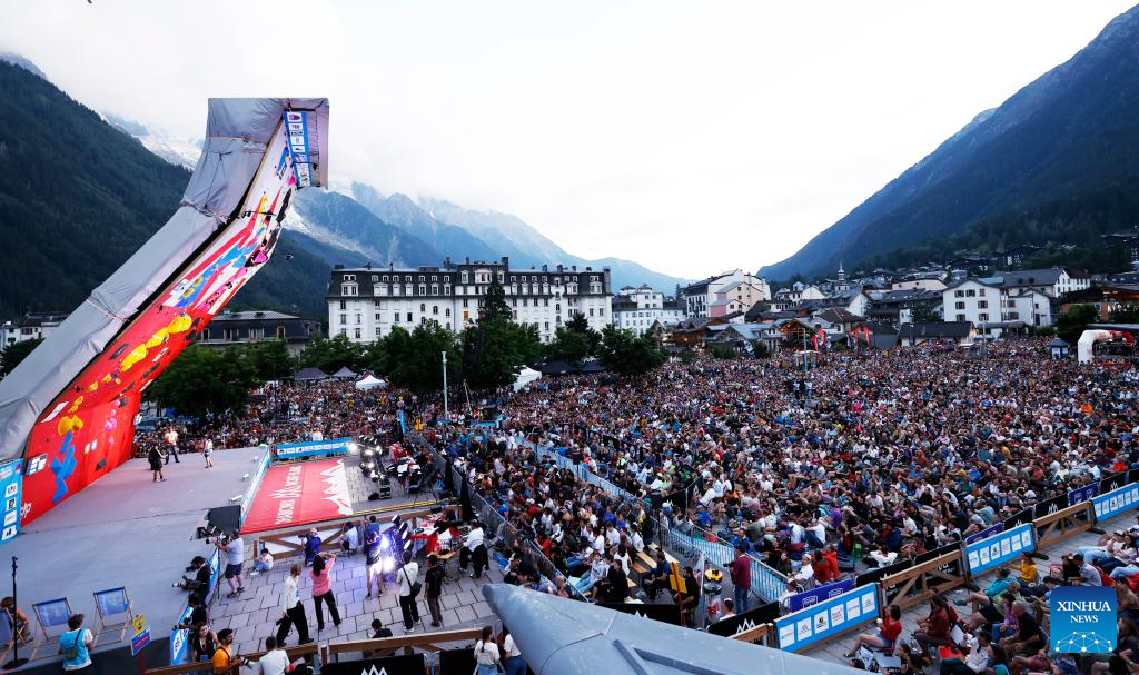 People watch the men's lead final of sport climbing at the 2025 IFSC Climbing World Cup Speed-Lead in Charmonix, France, July 13, 2025. (Xinhua/Gao Jing)