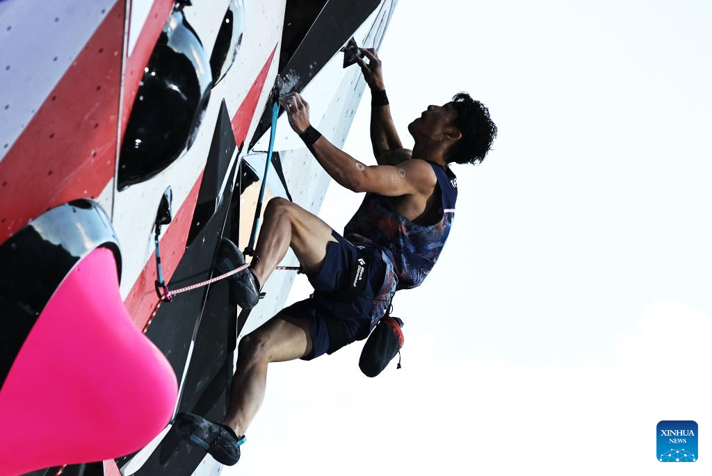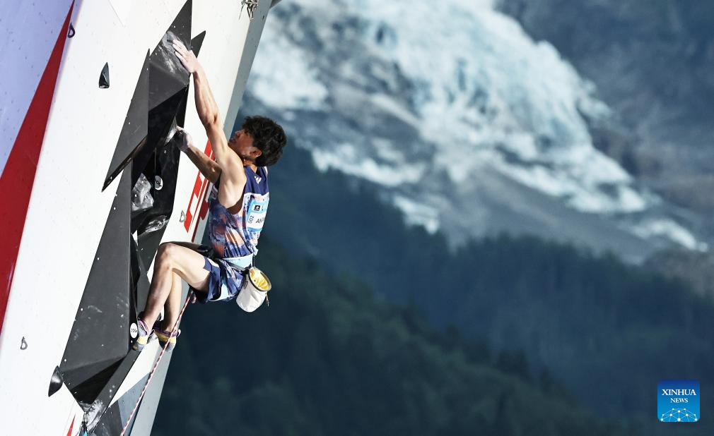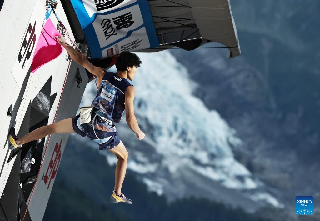 Anraku Sorato of Japan competes during the men's lead final of sport climbing at the 2025 IFSC Climbing World Cup Speed-Lead in Charmonix, France, July 13, 2025. (Xinhua/Gao Jing)