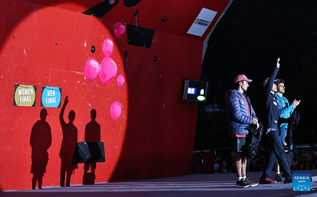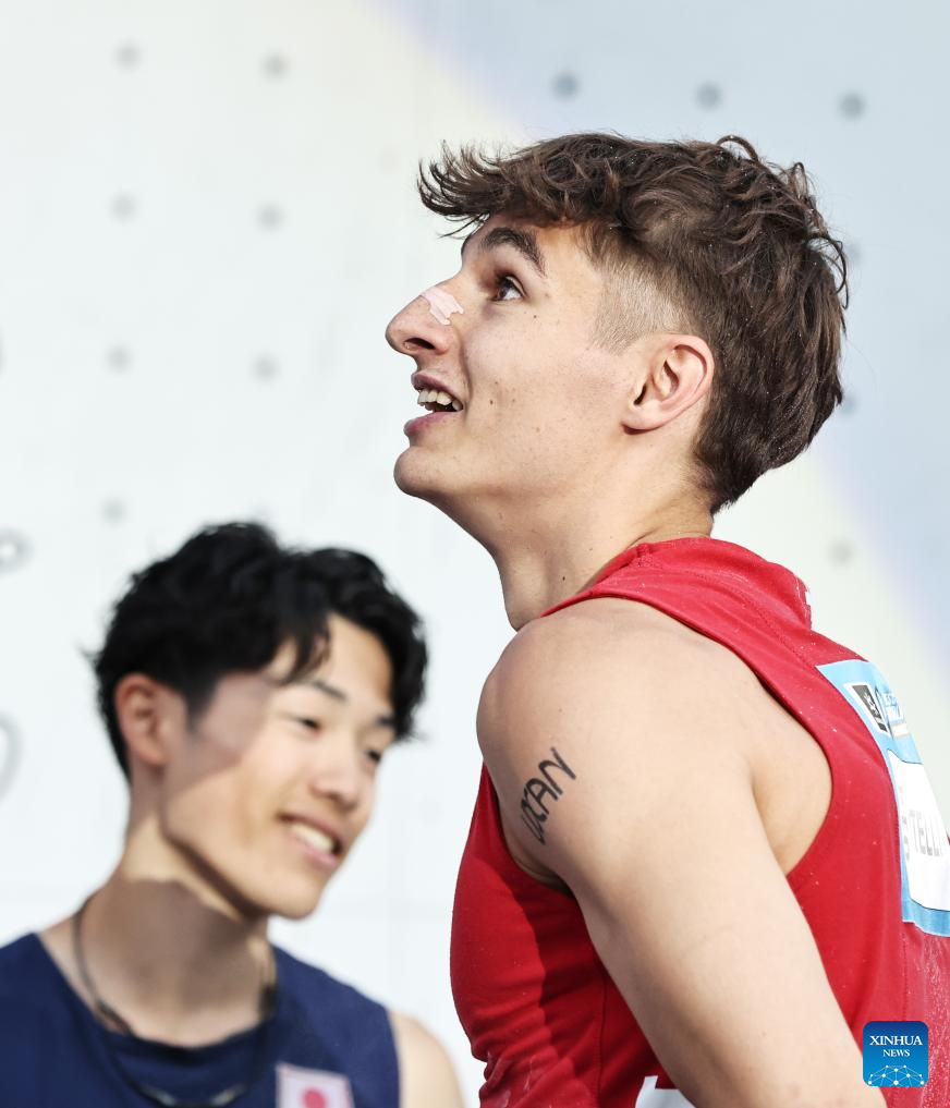 Jonas Utelli (R) of Switzerland reacts after the men's lead final of sport climbing at the 2025 IFSC Climbing World Cup Speed-Lead in Charmonix, France, July 13, 2025. (Xinhua/Gao Jing)