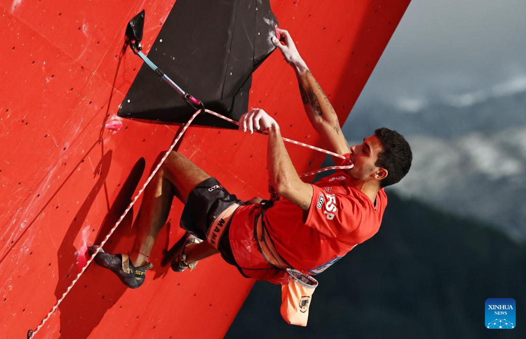 Filip Schenk of Italy competes during the men's lead final of sport climbing at the 2025 IFSC Climbing World Cup Speed-Lead in Charmonix, France, July 13, 2025. (Xinhua/Gao Jing)