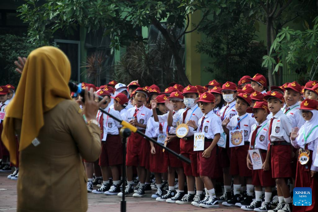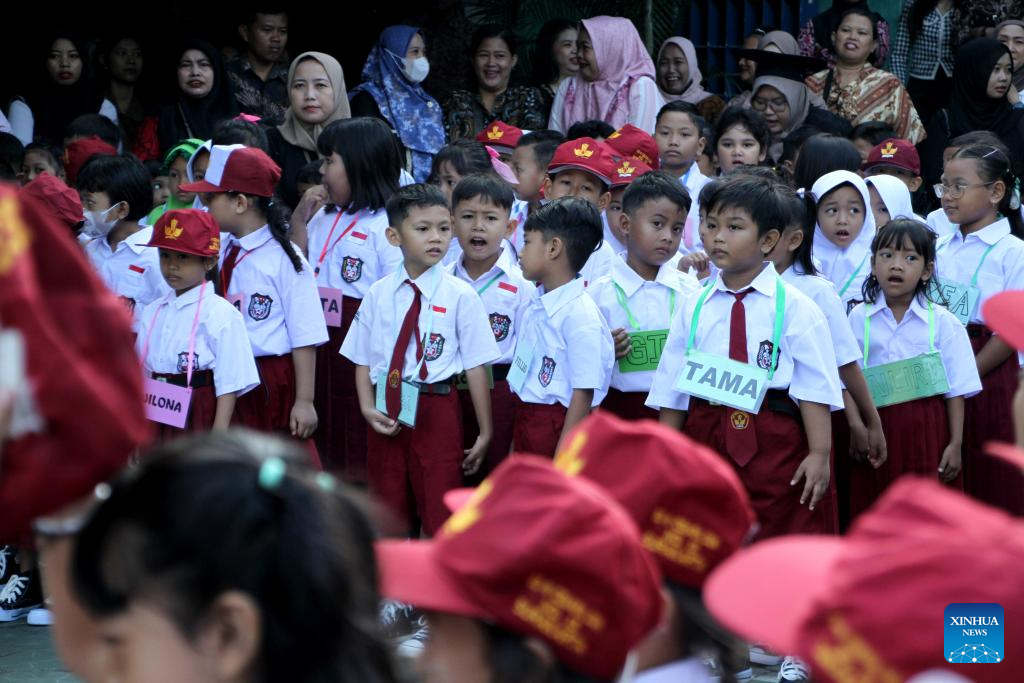 Students wearing name tags attend the first-day orientation of school year 2025-2026 at Cemara Dua elementary school in Surakarta, Central Java, Indonesia, on July 14, 2025. (Photo by Bram Selo/Xinhua)