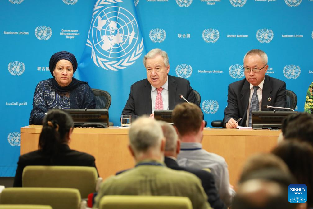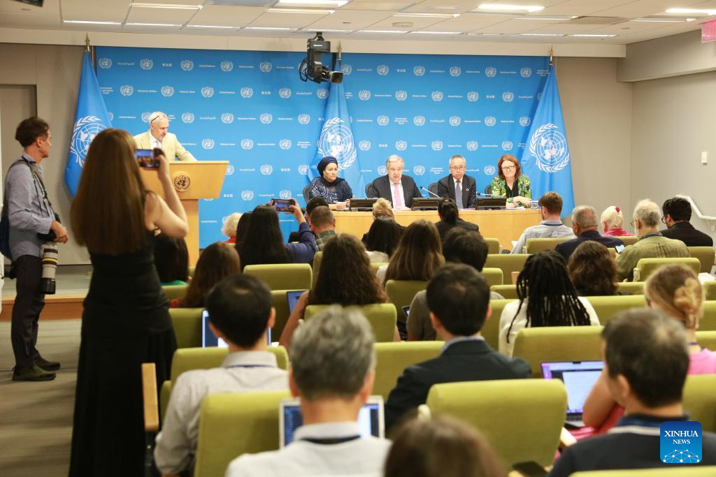 UN Secretary-General Antonio Guterres (C) speaks at the launch of the Sustainable Development Goals Report 2025 at the UN headquarters in New York, on July 14, 2025. With only five years to go, merely 35 percent of the targets of the Sustainable Development Goals (SDGs) are on track, while nearly half are stalling and 18 percent have regressed, according to a UN report released on Monday. (Xinhua/Xie E)