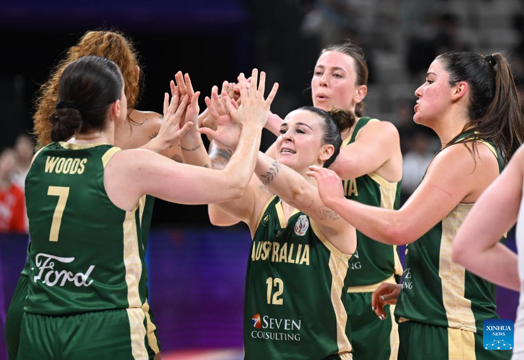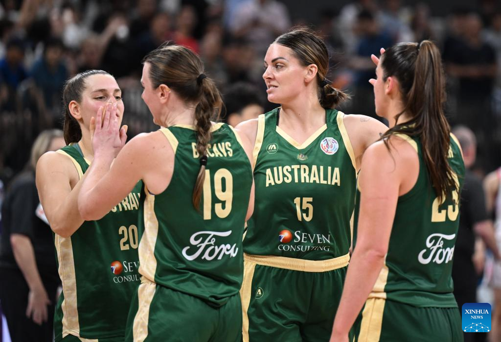 Players of Australia celebrate after the Group B match between Australia and Japan at the FIBA Women's Asia Cup Division A 2025 in Shenzhen, south China's Guangdong Province, July 15, 2025. (Xinhua/Deng Hua)
