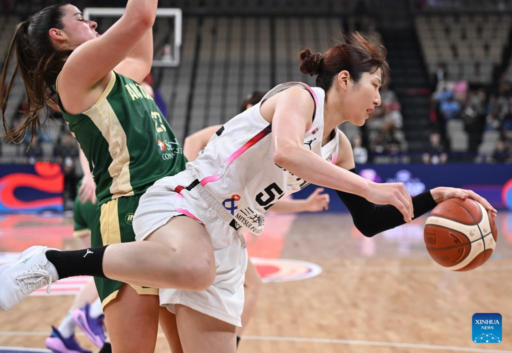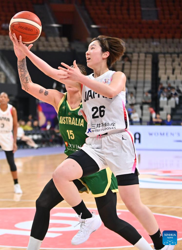 Tanaka Kokoro (R) of Japan competes during the Group B match between Australia and Japan at the FIBA Women's Asia Cup Division A 2025 in Shenzhen, south China's Guangdong Province, July 15, 2025. (Xinhua/Xiao Ennan)
