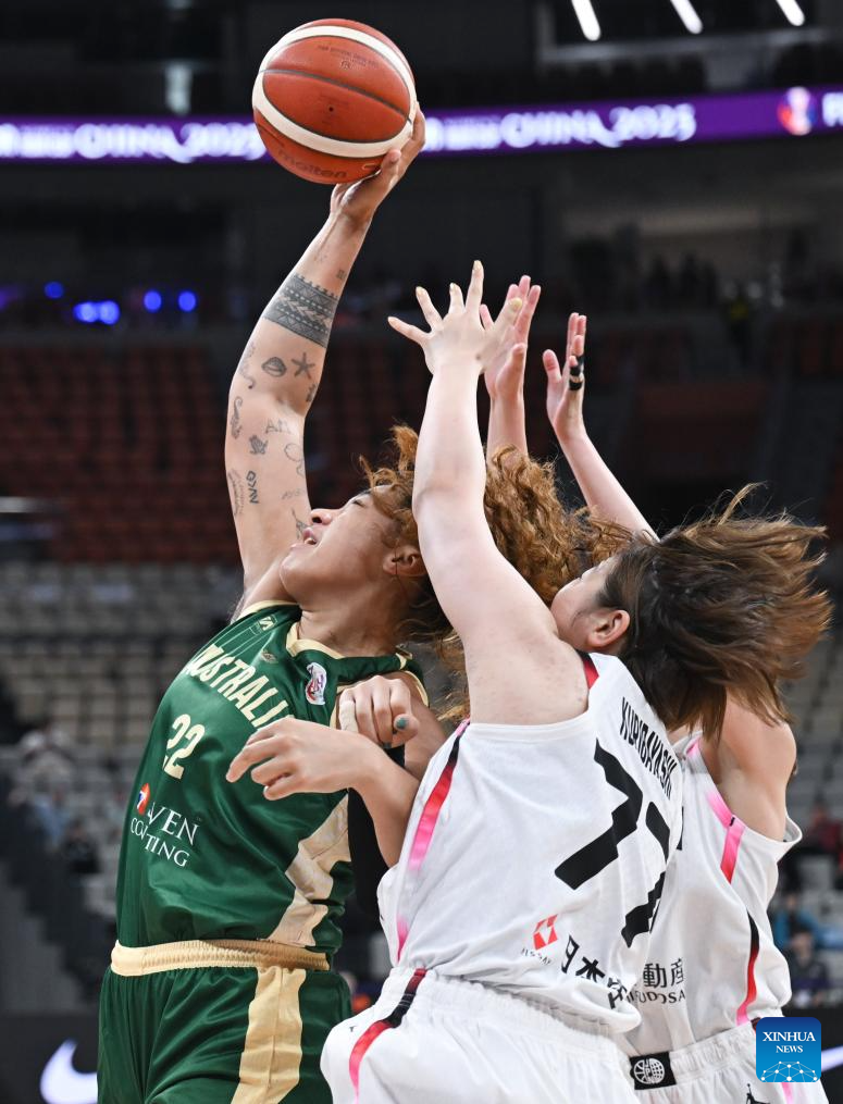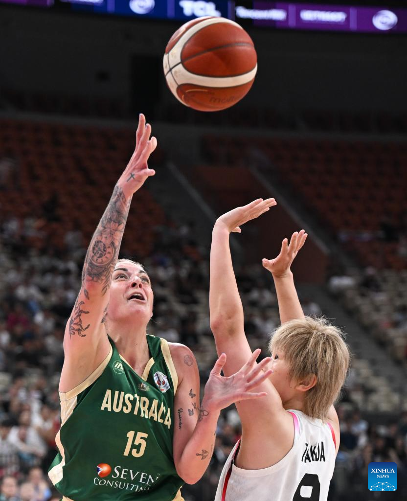 Cayla George (L) of Australia competes during the Group B match between Australia and Japan at the FIBA Women's Asia Cup Division A 2025 in Shenzhen, south China's Guangdong Province, July 15, 2025. (Xinhua/Deng Hua)