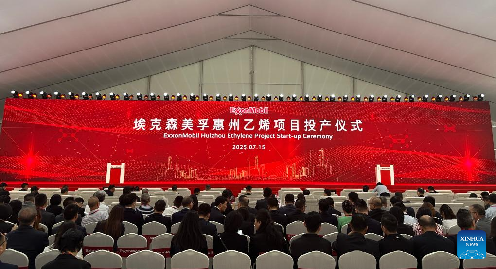 This photo taken on July 15, 2025 shows the launch ceremony of ExxonMobil's chemical complex in Huizhou, south China's Guangdong Province. (Photo by Wang Daying/Xinhua)