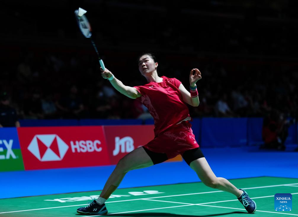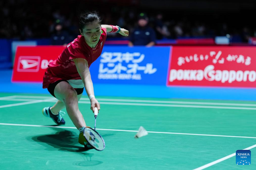 Gao Fangjie hits a return during the women's singles round of 32 match between Gao Fangjie of China and Line Hojmark Kjaersfeldt of Denmark at the Japan Badminton Open 2025 in Tokyo, Japan, July 15, 2025. (Xinhua/Jia Haocheng)