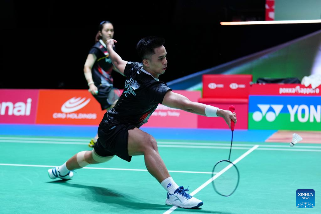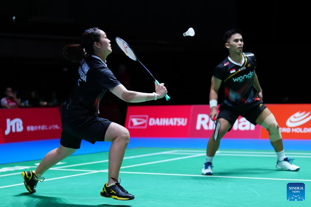 Amri Syahnawi/Nita Violina Marwah (L) compete during the mixed doubles round of 32 match between Cheng Xing/Zhang Chi of China and Amri Syahnawi/Nita Violina Marwah of Indonesia at the Japan Badminton Open 2025 in Tokyo, Japan, July 15, 2025. (Xinhua/Jia Haocheng)