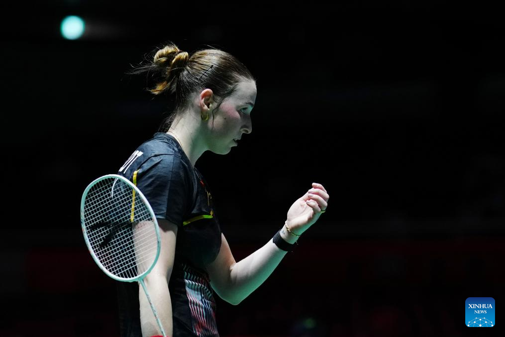 Line Hojmark Kjaersfeldt reacts during the women's singles round of 32 match between Gao Fangjie of China and Line Hojmark Kjaersfeldt of Denmark at the Japan Badminton Open 2025 in Tokyo, Japan, July 15, 2025. (Xinhua/Jia Haocheng)