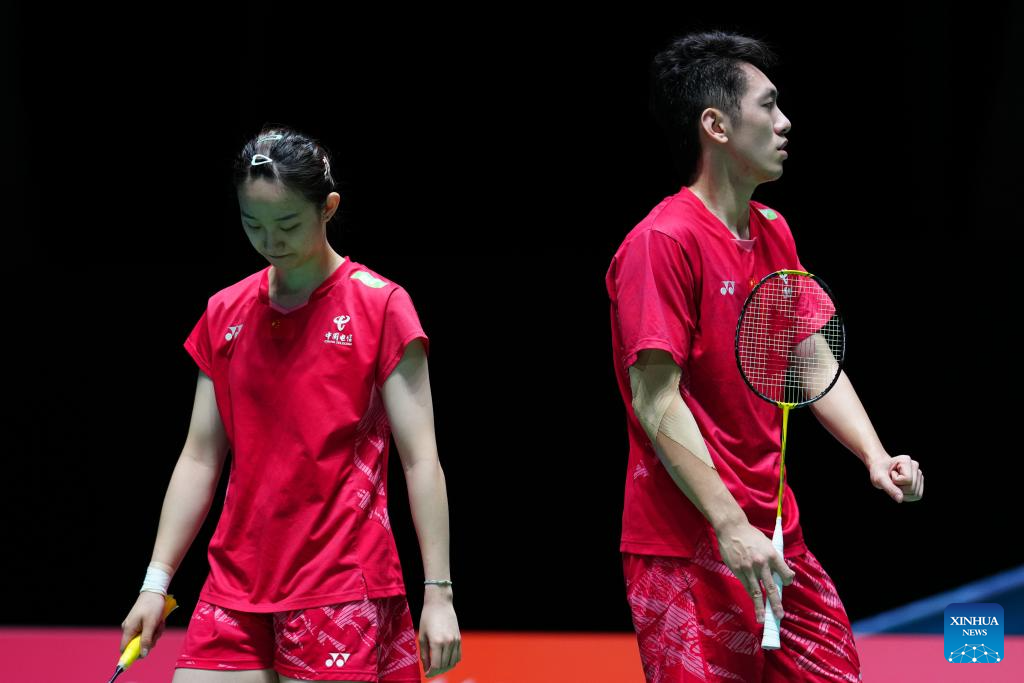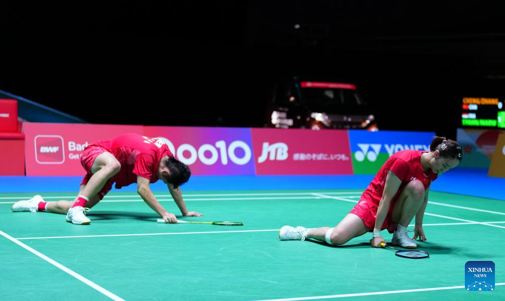 Cheng Xing (R)/Zhang Chi react during the mixed doubles round of 32 match between Cheng Xing/Zhang Chi of China and Amri Syahnawi/Nita Violina Marwah of Indonesia at the Japan Badminton Open 2025 in Tokyo, Japan, July 15, 2025. (Xinhua/Jia Haocheng)