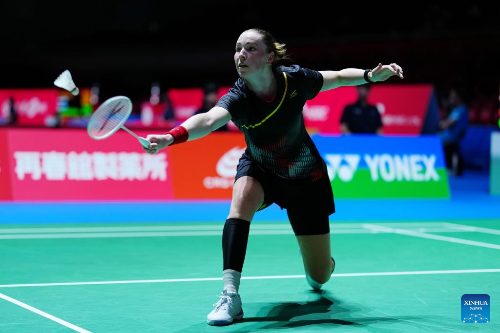 Line Hojmark Kjaersfeldt hits a return during the women's singles round of 32 match between Gao Fangjie of China and Line Hojmark Kjaersfeldt of Denmark at the Japan Badminton Open 2025 in Tokyo, Japan, July 15, 2025. (Xinhua/Jia Haocheng)