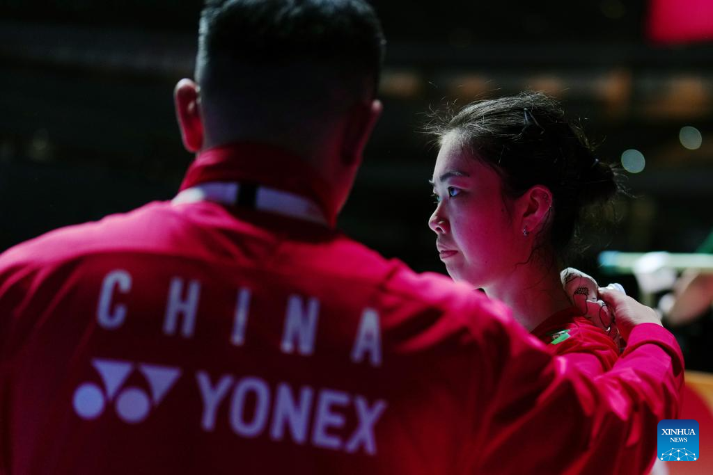 Gao Fangjie (R) listens to her coach during the women's singles round of 32 match between Gao Fangjie of China and Line Hojmark Kjaersfeldt of Denmark at the Japan Badminton Open 2025 in Tokyo, Japan, July 15, 2025. (Xinhua/Jia Haocheng)