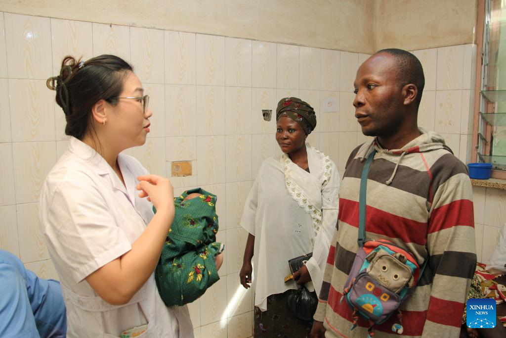 A doctor of the 27th batch of the Chinese medical team to Benin (L) talks with family members of a patient at the Mono and Couffo Departmental Hospital Center in Lokossa, Benin, on July 14, 2025. The 27th batch of the Chinese medical team arrived in Benin in January 2024, consisting of 22 members, including 18 medical professionals. They are stationed in Lokossa and Natitingou. Since their arrival, they have provided medical care to 15,382 patients, performed 2,758 surgeries, and organized 26 visits across Benin to provide locals with free consultation, treatment and, when needed, medication. (Photo by Seraphin Zounyekpe/Xinhua)